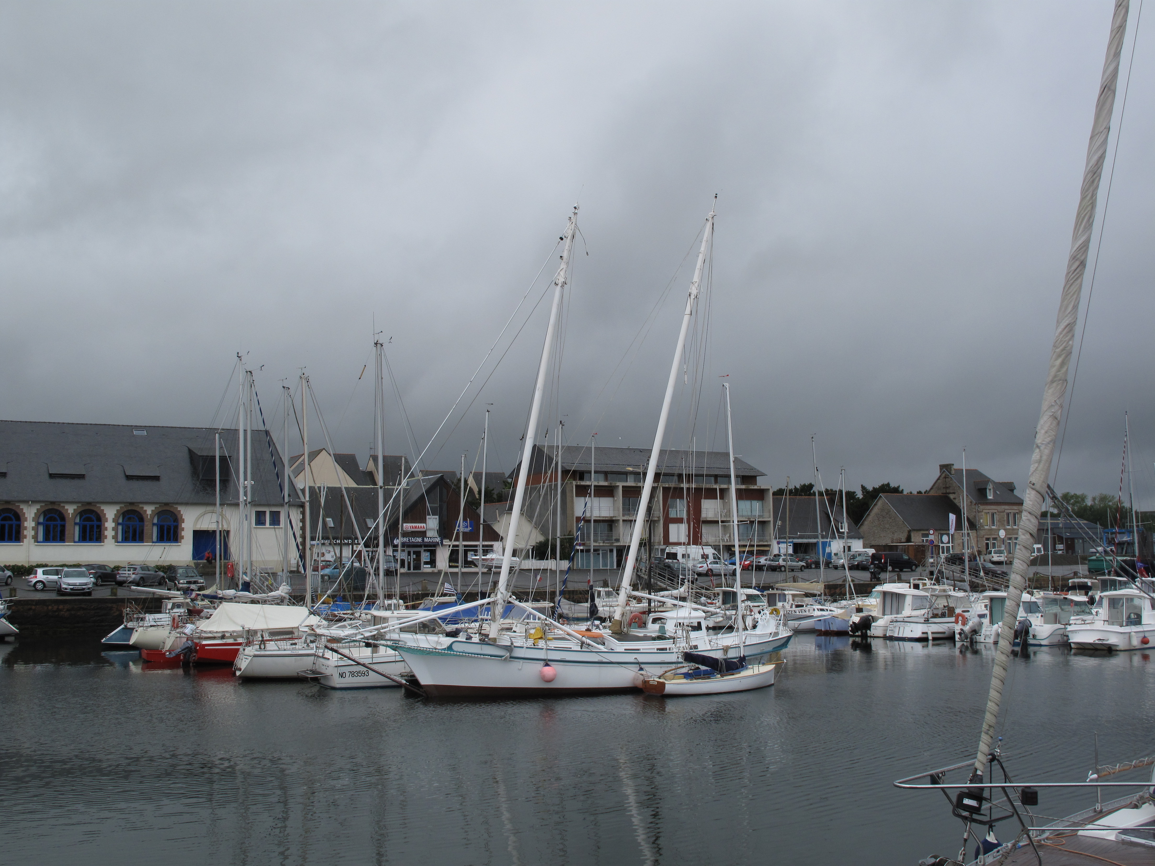 At the end of our Brittanny cruise we put into Paimpol for a couple of nights while a vigorous front blew through, as you can see it was grey, wet and windy. Getting up the channel from the isle de Brehat was the wettest part of our trip and with the lowest visibility that day. There is a shortcut through a narrow channel from port de la corderie on brehat but without either local knowledge or a large scale chart just didn’t fancy it on a very blustery and low visibility day so had to take the longer route around the tail of the island. Although a bit tricky the channels are well marked even if i couldn’t see the channel markers and beacons all the time.