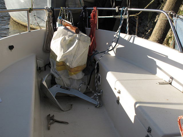The idea here is simple in that when i want to anchor i just heave the anchor over the rail and then work with the weighted warp which leads forward to the fairled and back along the side deck to what will be a newly fitted cleat. The cleat incidentally is one that i remove from just underneath the bow fitting (where the gaffer tape is) although a very strong 10 inch cleat its fastenings were as i suspected absolutely ‘naff’….just M6 bolts threaded into the GRP moulding. When i fit the cleat to the deck aft there will be a plywood pad under the deck at the least and when things are warmer i will bog in some nee layers of cloth covering the hull-deck join.