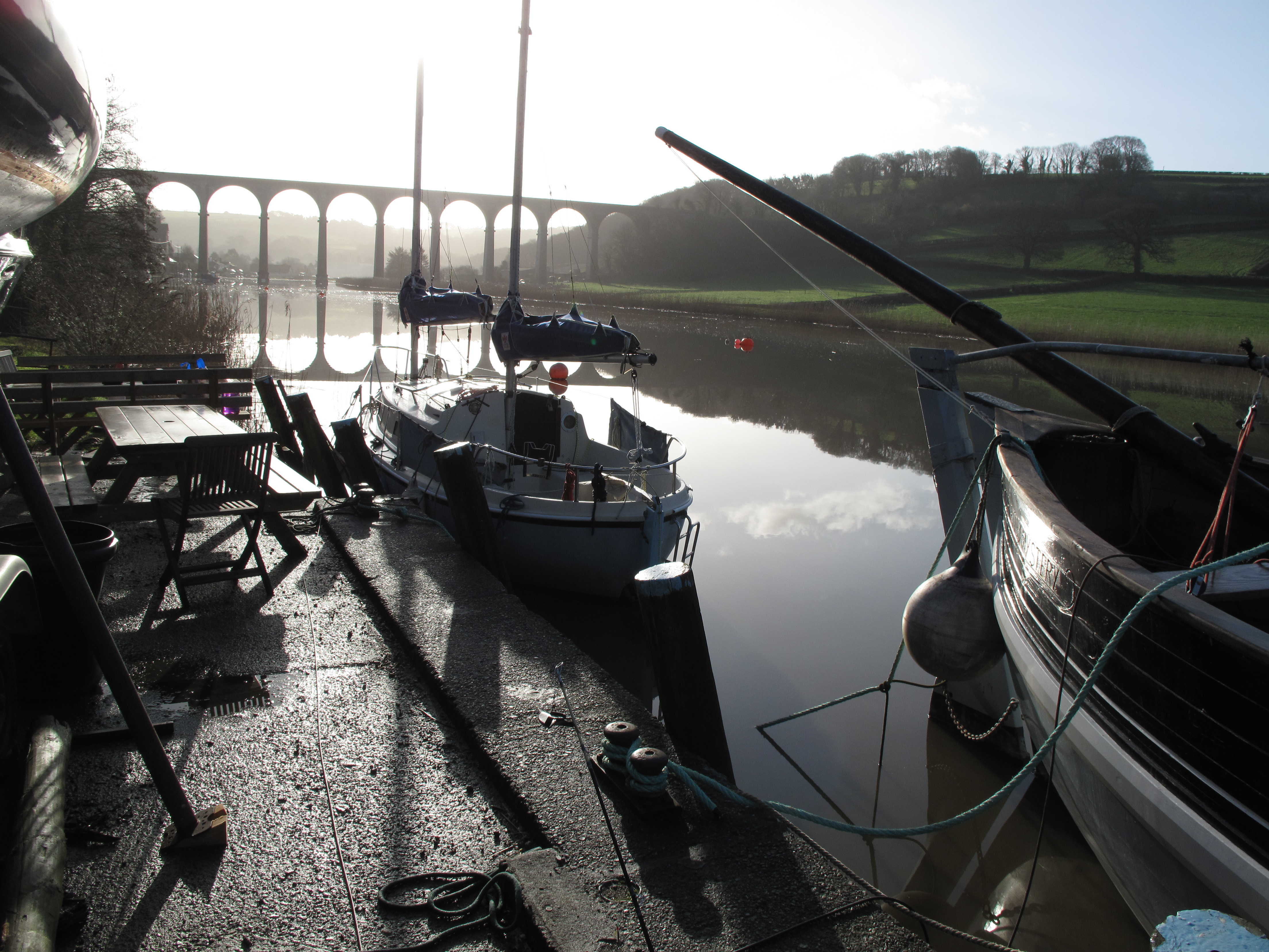 My own boat, a Hunter Liberty might best be described as ‘canoe’ sterned as its quite round, next to me alongside the wall is the Lugger , Spirit of Mystery and recently Chris has turned her round so that she is stern-on to me. Chris is wondering how to get the rudder off, i guess it will be a low tide job and some filthy messing around in the mud to get at the lower mounting. Spirit of Mystery by the way is the boat that Pete Goss built and sailed to Australia. The old Goss boatyard is just up the river from Calstock boatyard on the river Tamar where i hang out and keep my little boat.