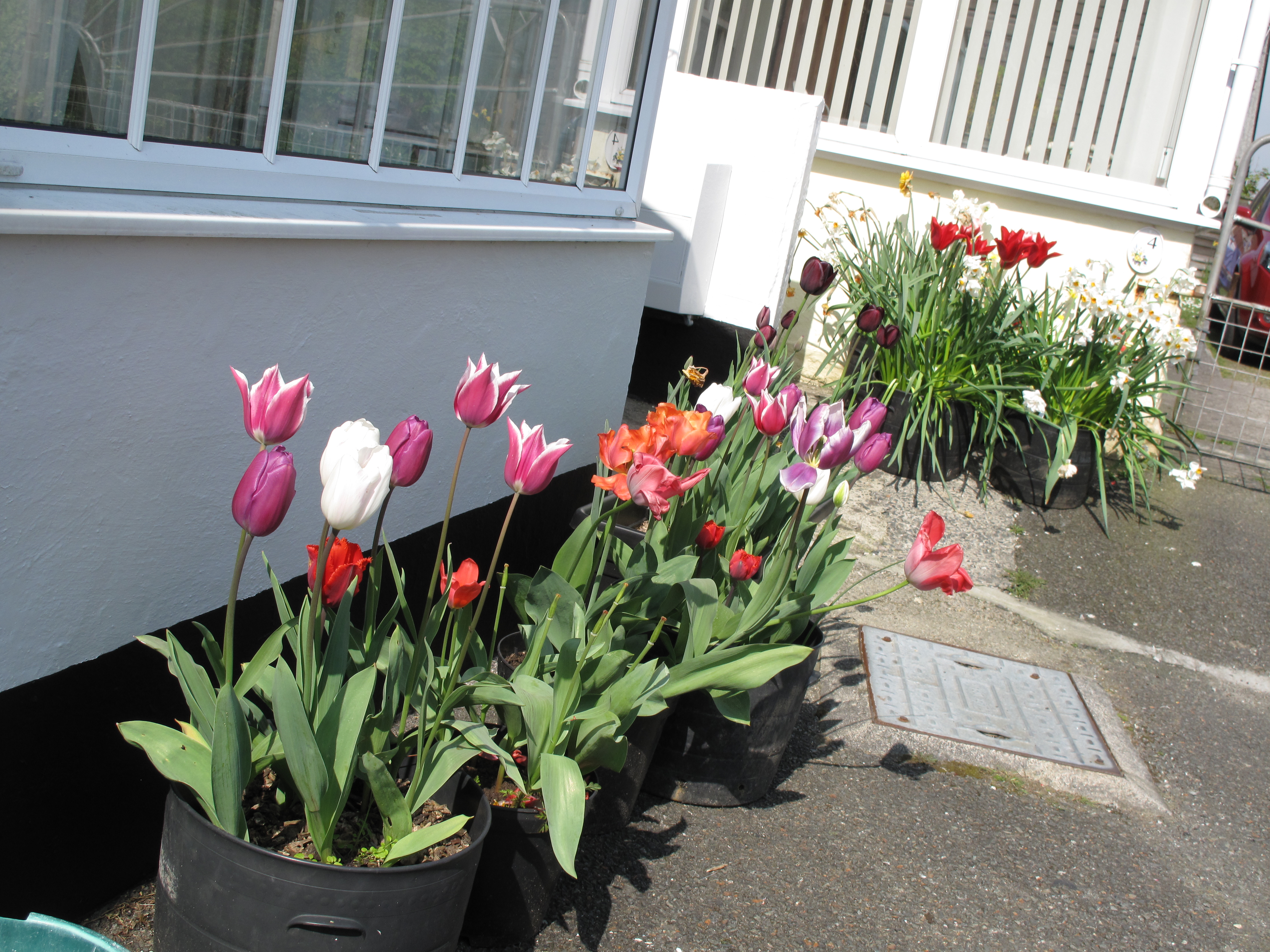 - Salad greens and tomatoes/peppers in the greenhouse. I like to create a display of colour immediately outside the house as i think that really cheers things up. What i do now is have 2 ‘waves’ of planting and colour : first planting that comes through are the early spring bulbs so mainly daffodils and narcissi and as they come to the end of their cycle i replace those containers with new ones planted up mainly with tulips and then alliums. I have never succeeded with late summer bulbs !….no idea why. What that means right now is that i am emptying out last years containers into the deep beds, sorting and drying some of the bulbs and getting new containers ready to plant. Soon i will do my yearly shop for next years bulbs : i find that the tulip bulbs just don’t last very long and don’t mind the expense of buying a few packs. Old bulbs go back in the garden border or this year will go into the back garden project. Containers.