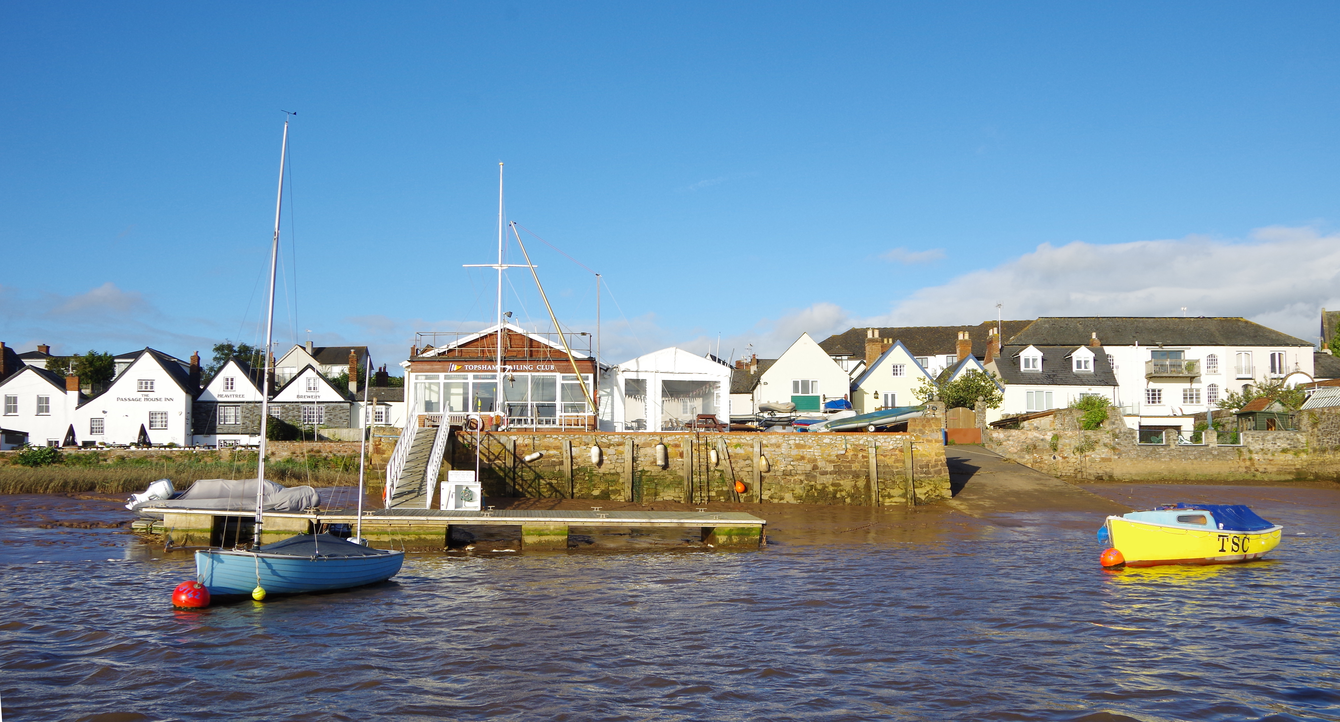 We are just back home after 10 days sailing WABI”’ from our home mooring at Calstock boatyard along the eastern section of the west-country via the Yealm, Salcombe, the Dart and Torbay : several of those being almost completely new territory to me.  WABI”’ is now alongside in a mud berth at Topsham which is pretty much the practical head of navigation for sailing boats on the Exe estuary.  The title photograph was taken during a brief period of sunshine in-between heavy rain showers and plenty of wind : that is the Topsham sailing club jetty and their clubhouse and yes a Devon Yawl out front. We spent a night on one of their club moorings and then met the bar manager Richard who was extremely helpful to us when we went alongside the next morning to try and find a berth or a mooring.  As it worked out although Richard kindly offered us the use of a club mooring we actually managed to sort out an ideal mud berth at the boatyard just downstream (Trouts) where we plan to be for the autumn and winter.