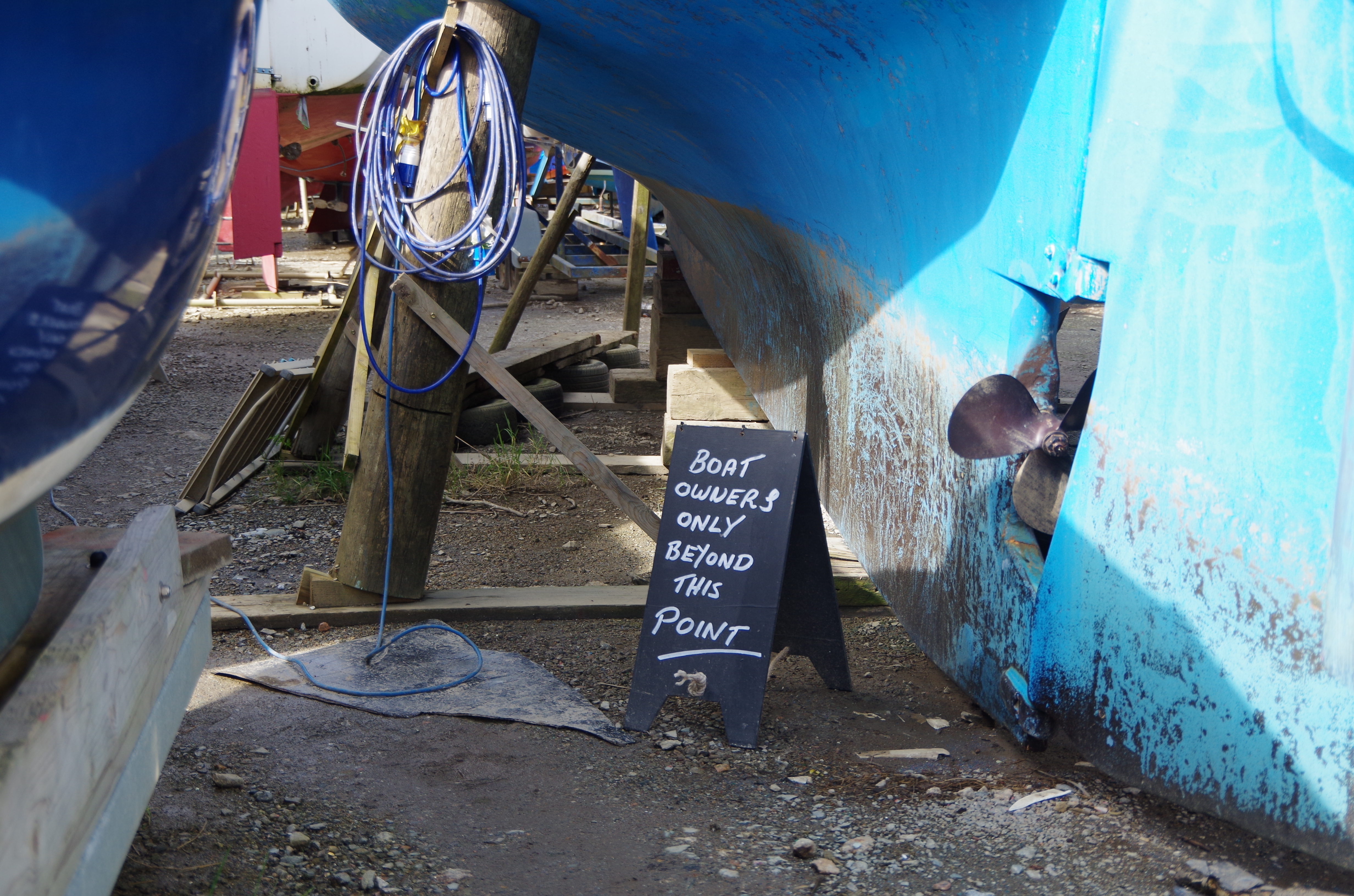 The yard is incredibly tightly packed this year such that i have had to find an almost 3 dimensional route from my boat out to the cafe end and duck and dive around some of the boats and their cradles.   The boss’s big boat ,Spirit of Mystery is already in the water and alongside with a much larger new visitor which i believe is a converted sailing and liveaboard ex fishing boat recently back from some long term cruising.