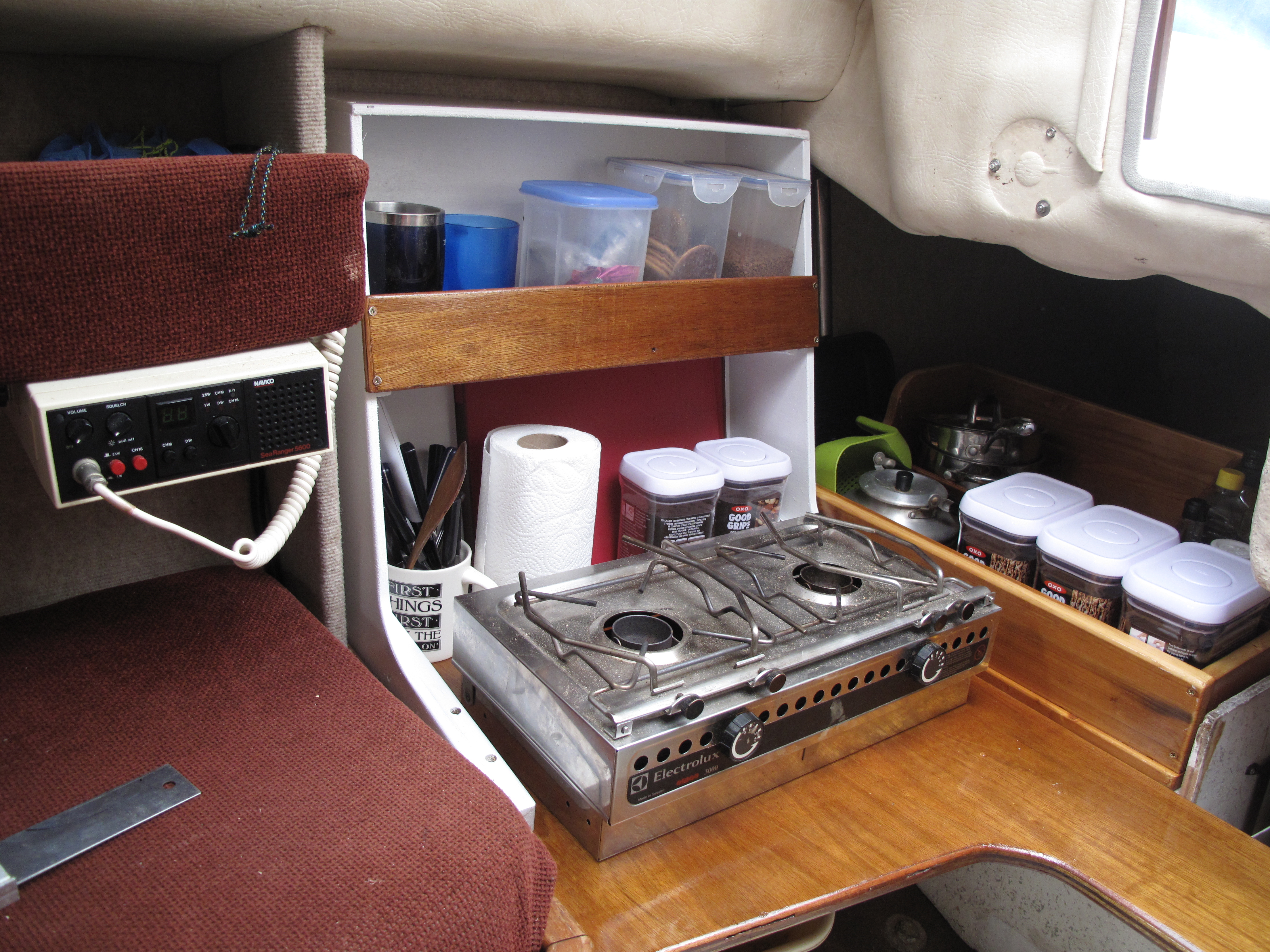 I may temporarily be back to being merely ‘2 boat’ Steve as i now only have one boat in Cornwall and one in Suffolk….how posh is that ? . However i am also temporarily ‘3-stove’ Steve in that i now own 3 Origo alcohol/meths stoves as WABI”’ has a double burner version, i have just taken the similar one off Inanda and i won a secondhand single burner Origo on Ebay last week. The single burner stove will be going on the little counter top just inside the companionway aboard Inanda.