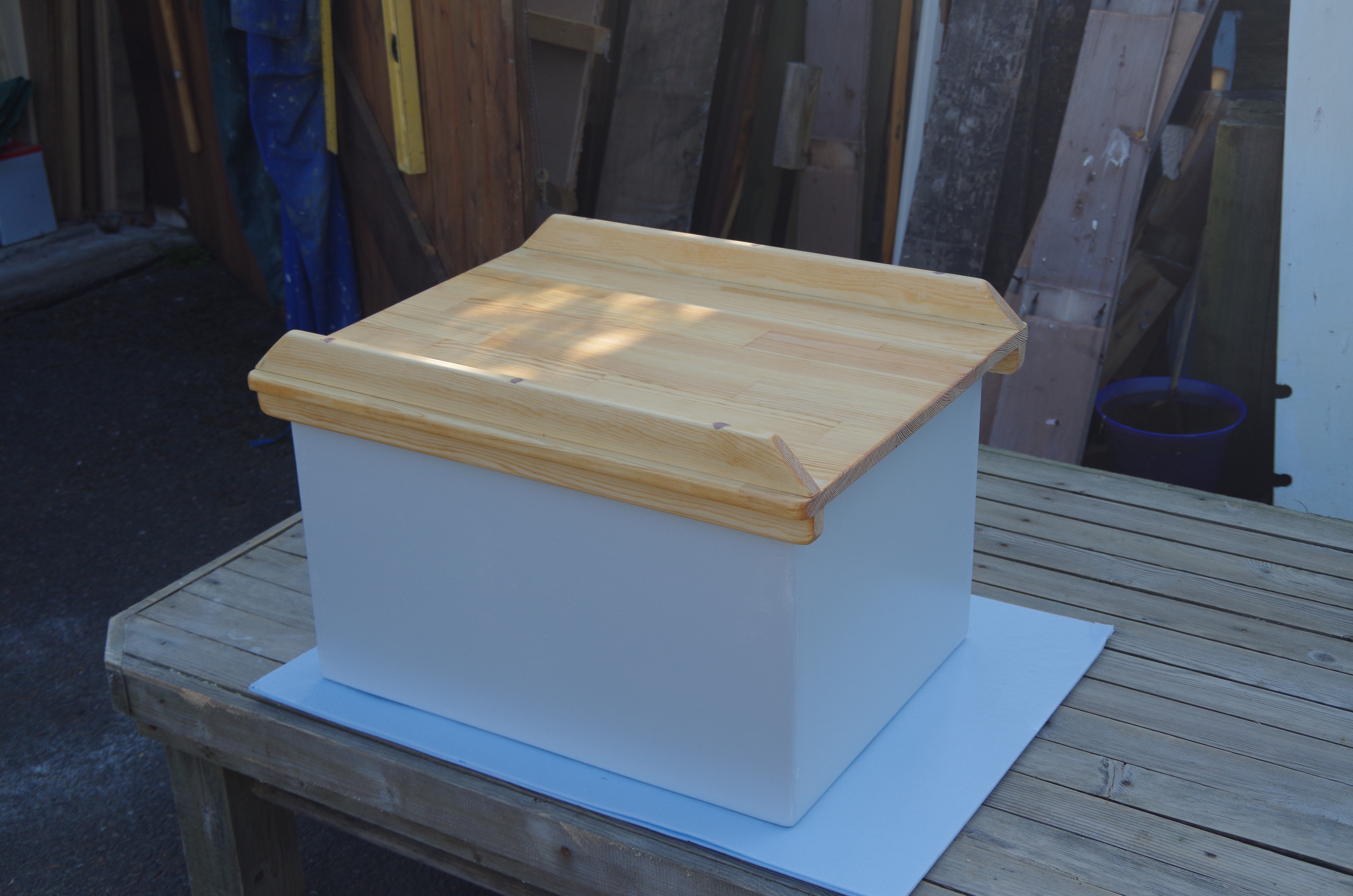 Making the top. I had hoped to make a decent lid out of scrap wood i had laying around….like the remnants of the old bathroom floor. Unfortunately i really need the top to be flat and plane so that i can use it as a chart table and general boat table-top. My small craft chart folio’s are about the same size as the box itself and it will be sheer luxury to have a chart table aboard Inanda. Instead of scrap i actually had to drive over to the DIY store and buy a couple of boards and then edge-glue them together on my improvised glueing bench…..epoxy went off nicely in the sun today. Meanwhile the box is in the workshop getting some paint on.