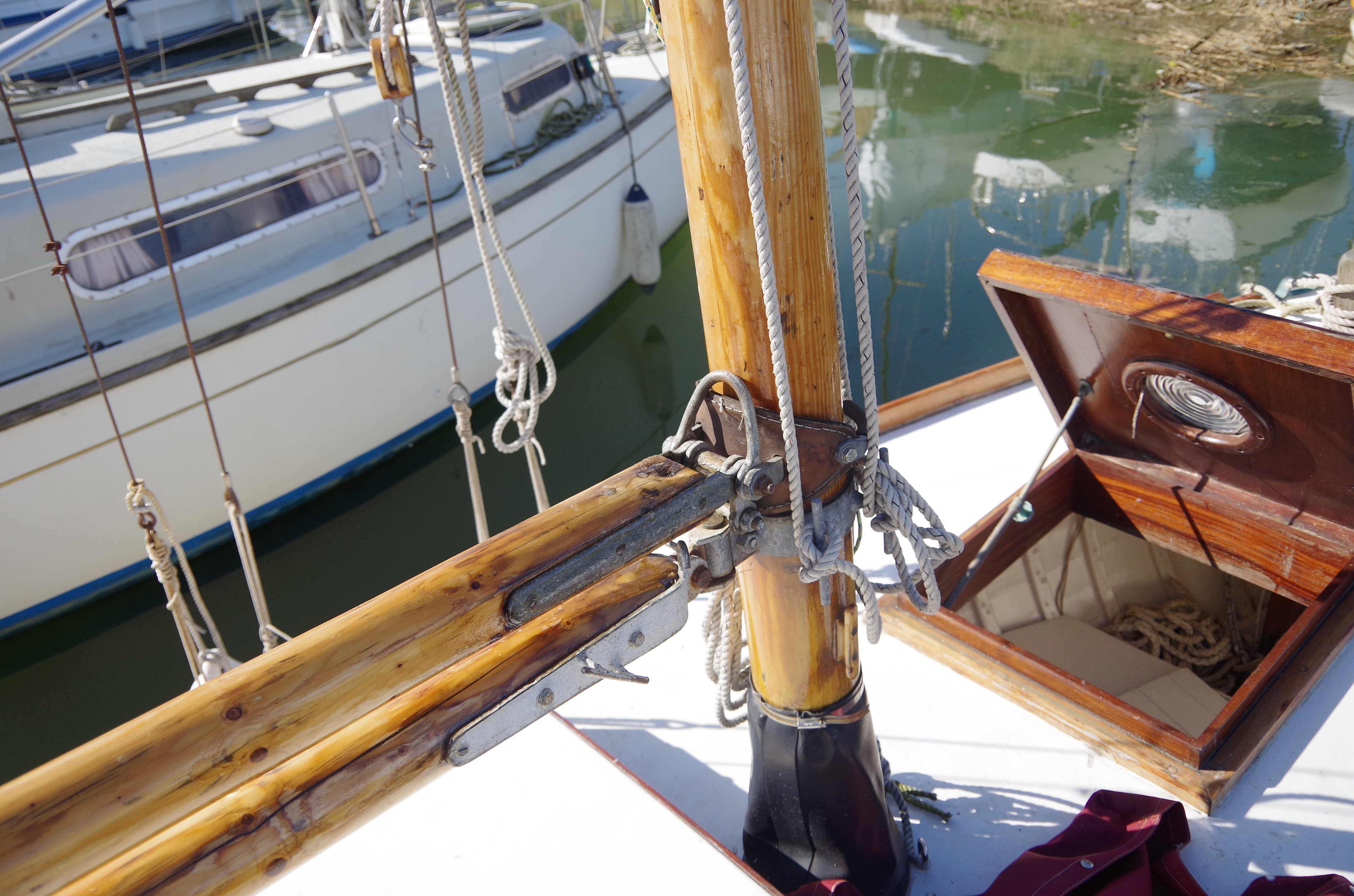Stage 1…move gooseneck band up mast slightly to improve cockpit clearance and permanently use first reef. Long term : reduce boom and gaff to original dimensions and re-cut main. Replace mainsheet, add jammer.