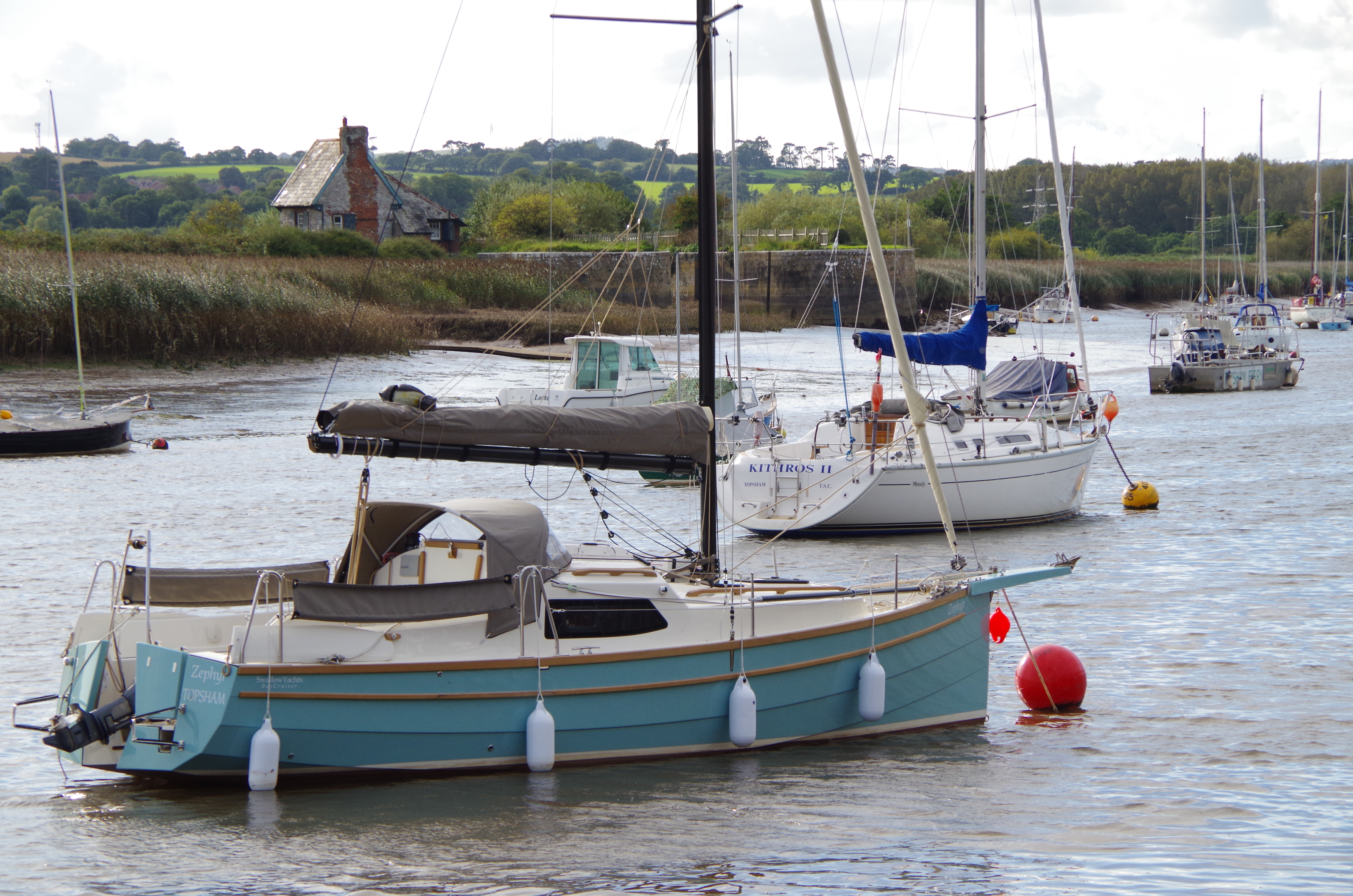 There are a couple of other manufacturers making shallow draft cruising boats today : Cornish Crabbers for example. Shrimpers and Crabbers are well represented on this coast and very popular : the Shrimpers even having a racing fleet.  While i always liked the Shrimper design and the later Yawl i never liked the Crabbers . It really shouldn’t be an issue but somehow sticking a gaff rig on a plastic hull just doesn’t seem right and i realise the personal bias there especially because it does often work on home built wood/epoxy designs.   This boat below is the Cornish Yawl design which i photographed on a lovely but cold morning on the Exe.   From what i know of them they are shallow draft but with a board coming through a long keel and would need legs to dry out level.  At some time i would like to do a more complete review of this design.  For today’s post i should also mention the many designs intended for home build that would fit the bill….the boats from Dudley Dix really come to mind but, once again, that’s a whole separate post intended as i get out there and do the work.
