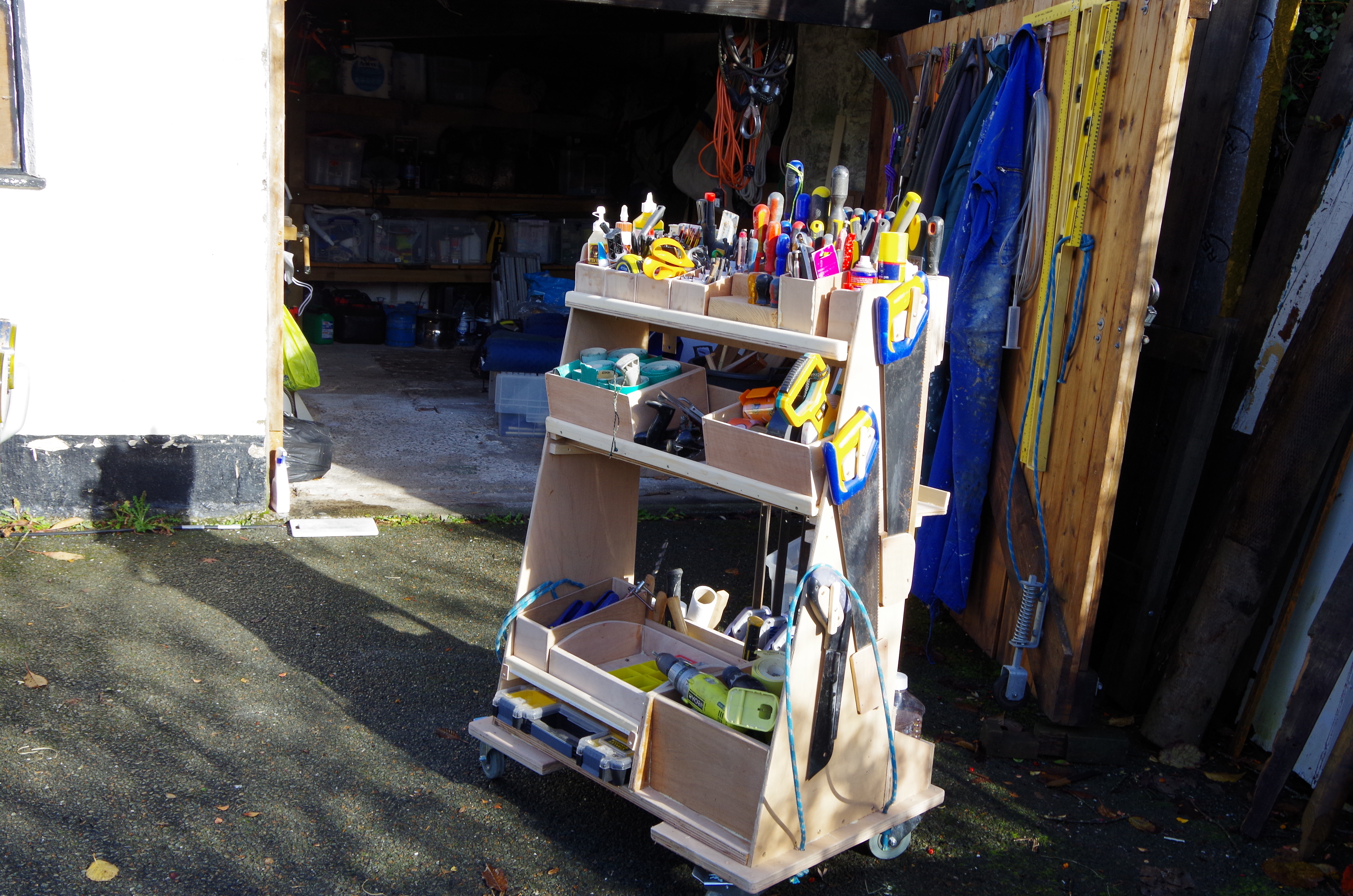 The new tool storage solution is a rolling stand that i can wheel outside because i do a lot of work outside especially when i am making stuff on the old garden bench which i use as my cutting bench for full sheets of plywood. That really came into it’s own when we did the bathroom build because we were able to mark out and cut all the plywood for the floor and walls on it but i noticed even then that there was nowhere to put tools , except on the ground, in between using them. I did think about building a much larger tool rack on the inside face of the workshop door, as it is that’s where i store the garden tools already but it does tend to get wet so that wouldn’t be good for my woodworking tools.