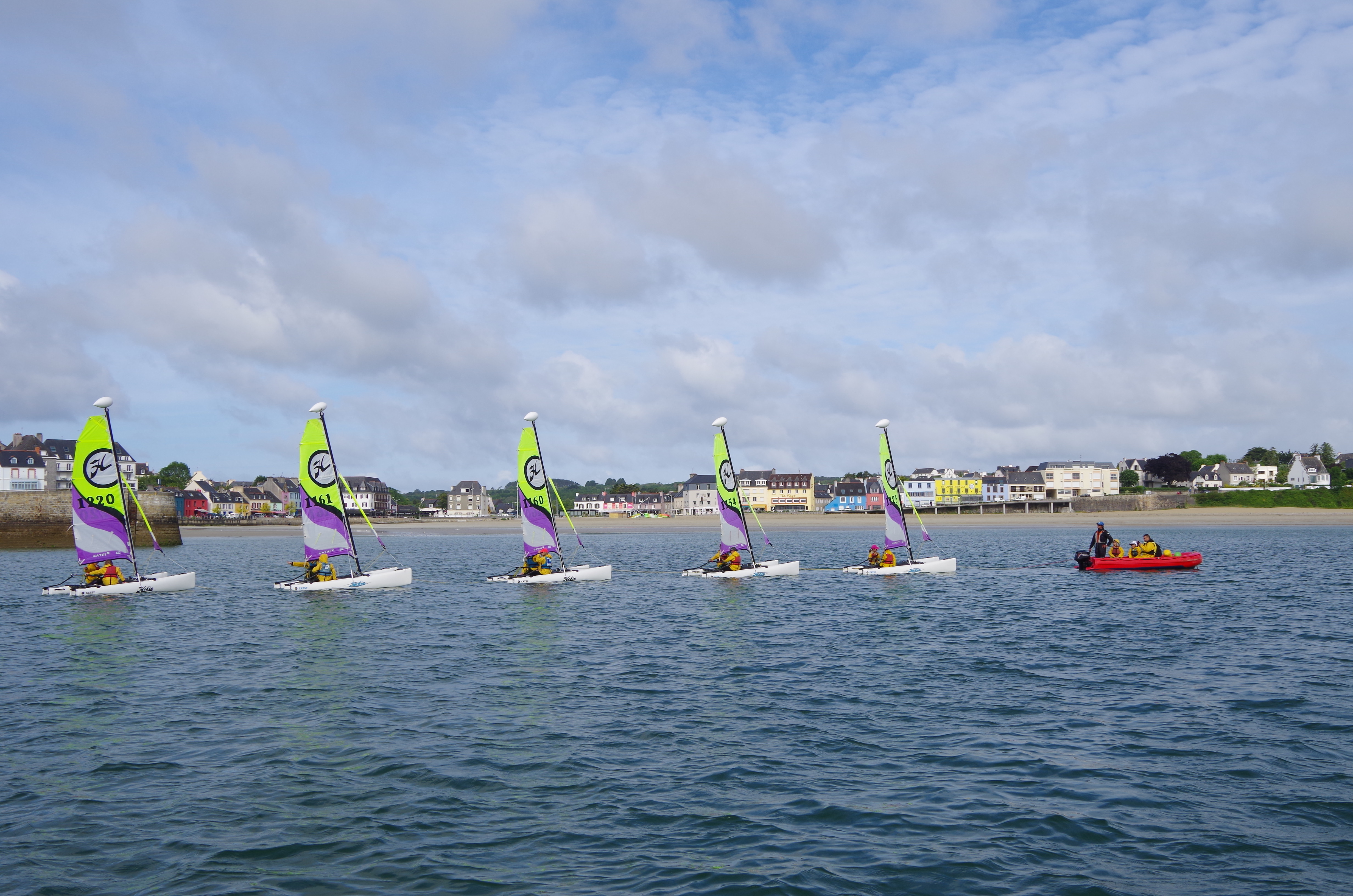 In Audierne the sailing school there I saw out several times and made it as far as nodding/bonjour terms with the RIB driving instructor. On my last day there he was obviously running a slightly advanced class of young teenagers, just about, on very quick looking little cats complete with trendy black square top mains (reefed) and the days lesson looked like an introduction to using the trapeze !. A couple of the teenage crews mainly did a lot of excited squealing but one crew of 2 young girls definitely had the idea of heading for the horizon at full multihull speed and the instructor had to go tear-arsing after them.