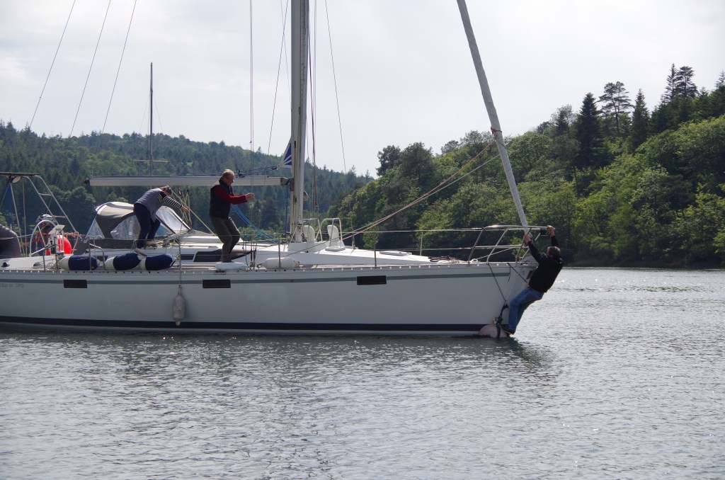 After we had dealt with the immediate aftermath of our dismasting we managed to get in under the cliffs at the river Dart entrance where we got the remains of the rig back aboard and sorted ourselves out with a coffee : after that we motored upstream a ways, got onto the first mooring that was easy and started to tidy up…..it was then that i looked in the big cockpit locker and found it more than half full…..yes, we were actually flooding as well. I thought at first that the rig must have pierced the hull somehow but it wasn’t that but one of the cockpit seat drain pipes had come off it’s fitting and the sea was simply siphoning back up the pipe and into the locker : weirdly when i emptied the locker right out to finish scooping out the sea and chucking it back where it belonged i found the jubilee clip in the bottom of the locker…..clearly off and as clearly mis-shapen and iv’e absolutely no idea how it came off : so yes, we nearly sank at the end of that as well.