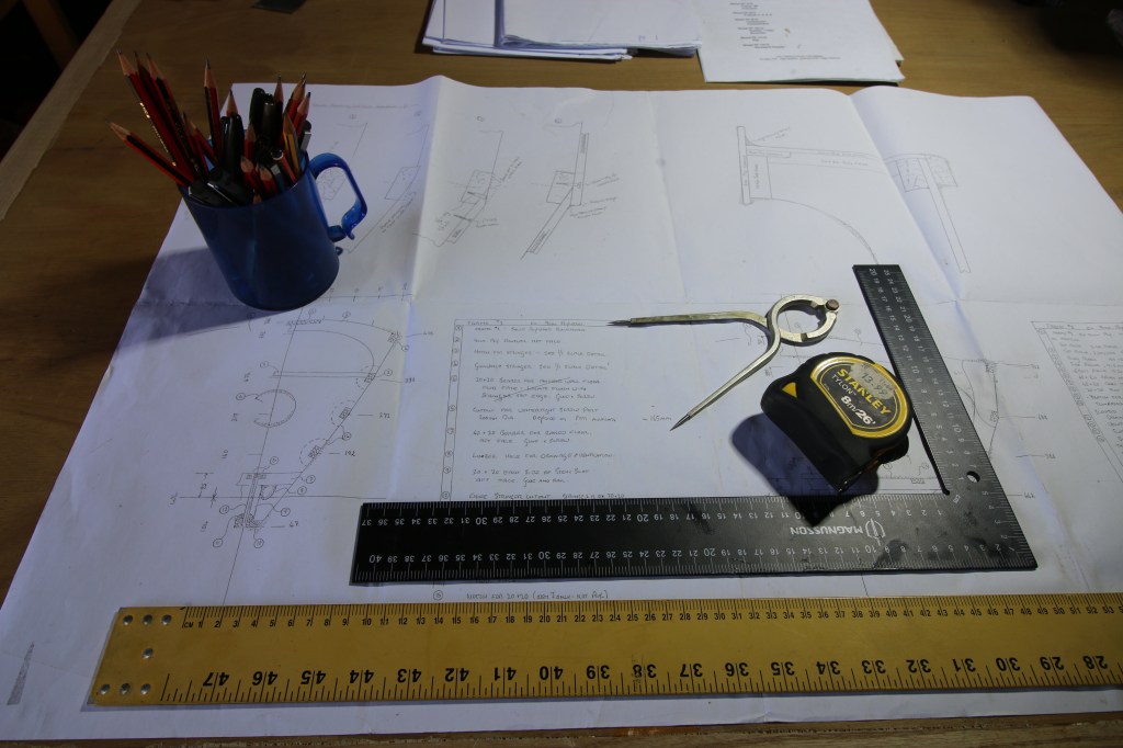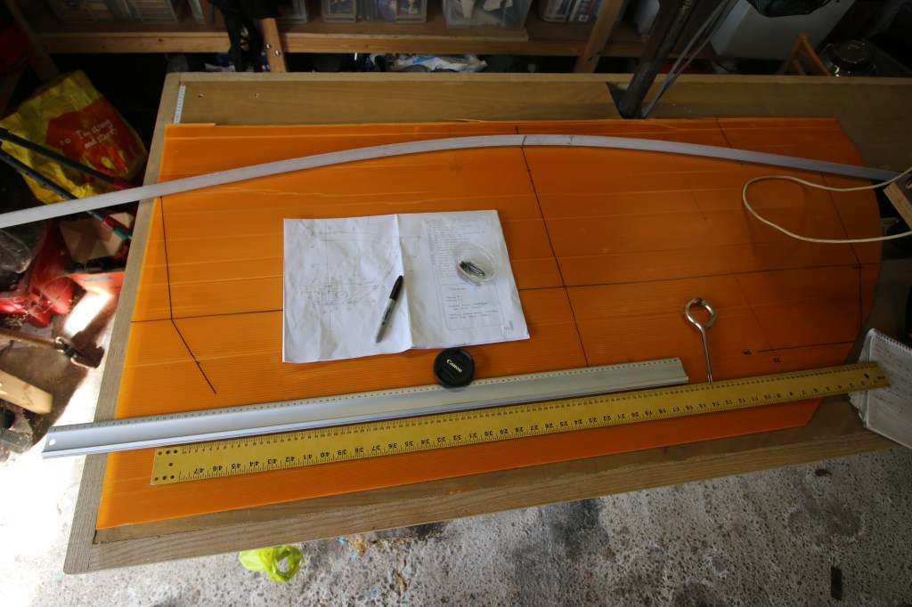 I also bought a new long measuring straight edge that is 1000 mm i think , that’s the one next to my old yellow straight edge which only has marks at 2mm, the new one is in 1mm markings and a lot crisper too. I use the tape measure very little and in fact only to rough out the measurements on a whole sheet of material to work out how much i need to cut and bring inside to work on. The black square is what i use to mark out my centerline at 90 degrees to my datum (waterline) mark. It might seem very ‘minutiae’ to mention my marking out tools but iv’e found that it makes a huge difference which pencils and markers i use on different materials ; for most jobs on the light plywood i now find that a ‘B’ pencil gives me the best combination of a dark line that is still sharp, one the plastic that doesn’t work so a 0.5mm pilot pen does that job and then my cutting lines are marked in using a fine Sharpie marker….although that looks thick it really helps in the photographs to show what is going on.