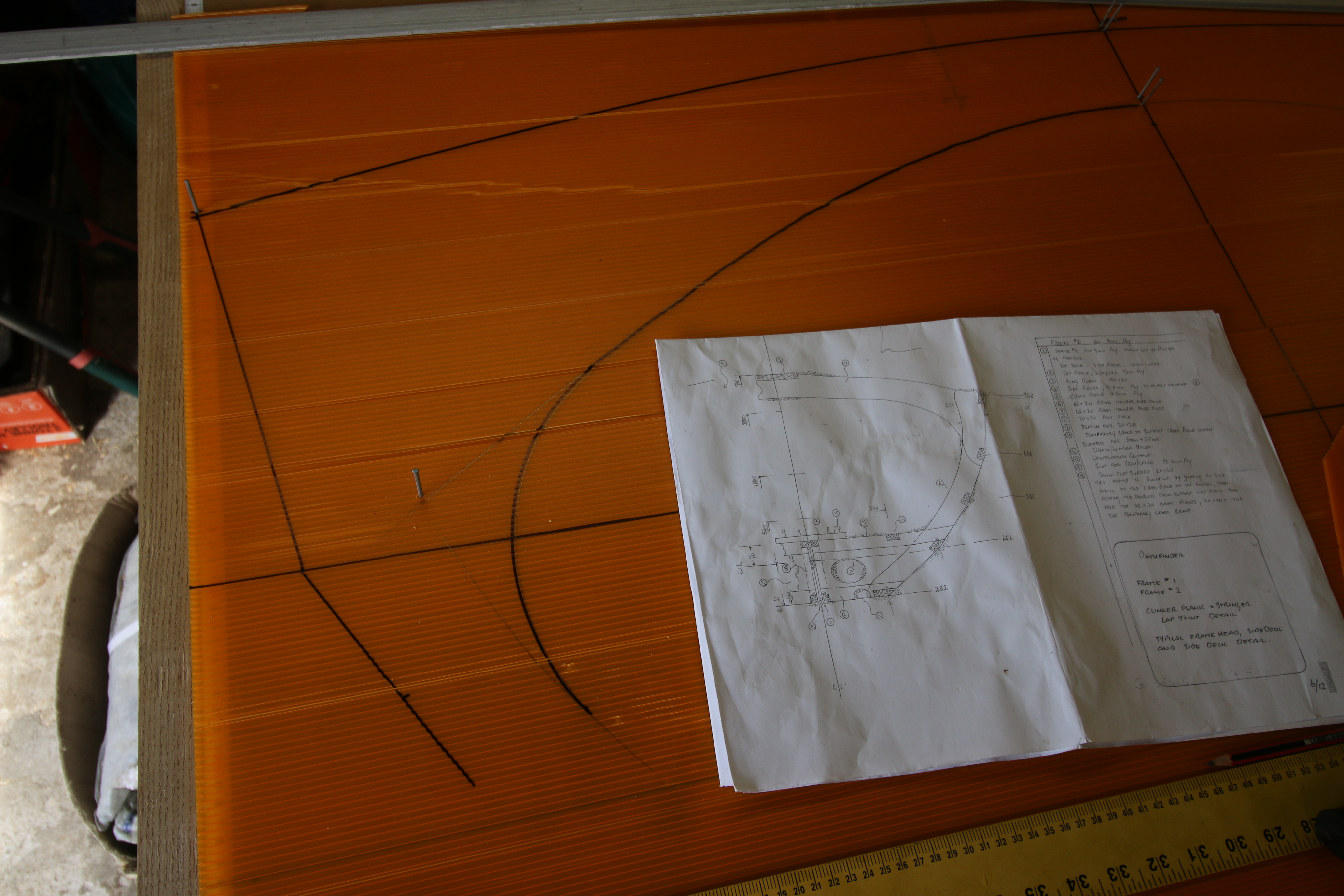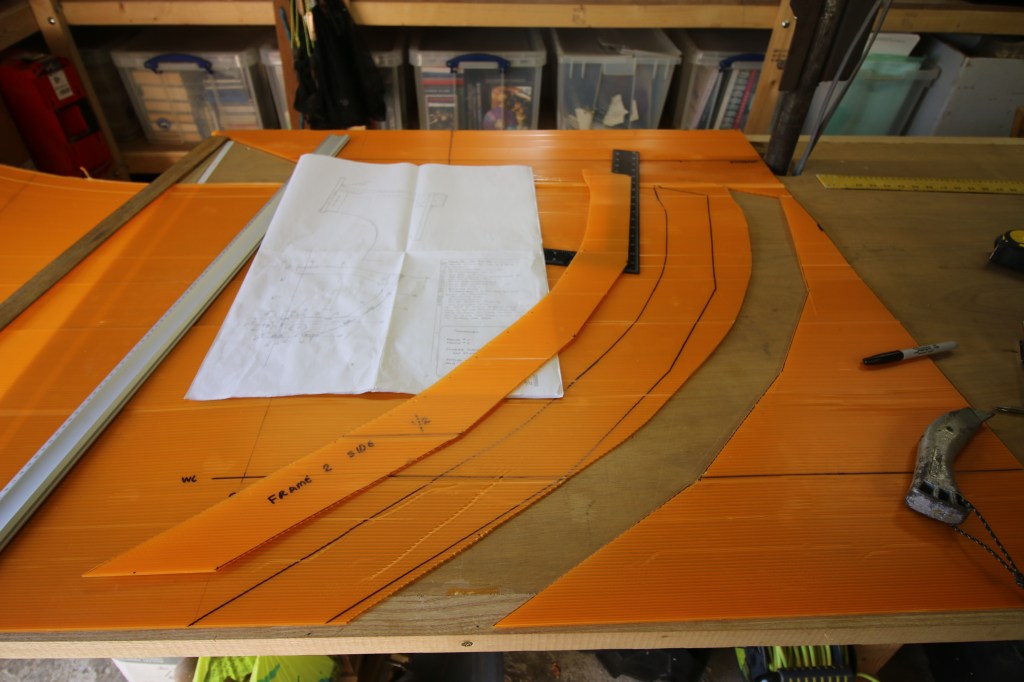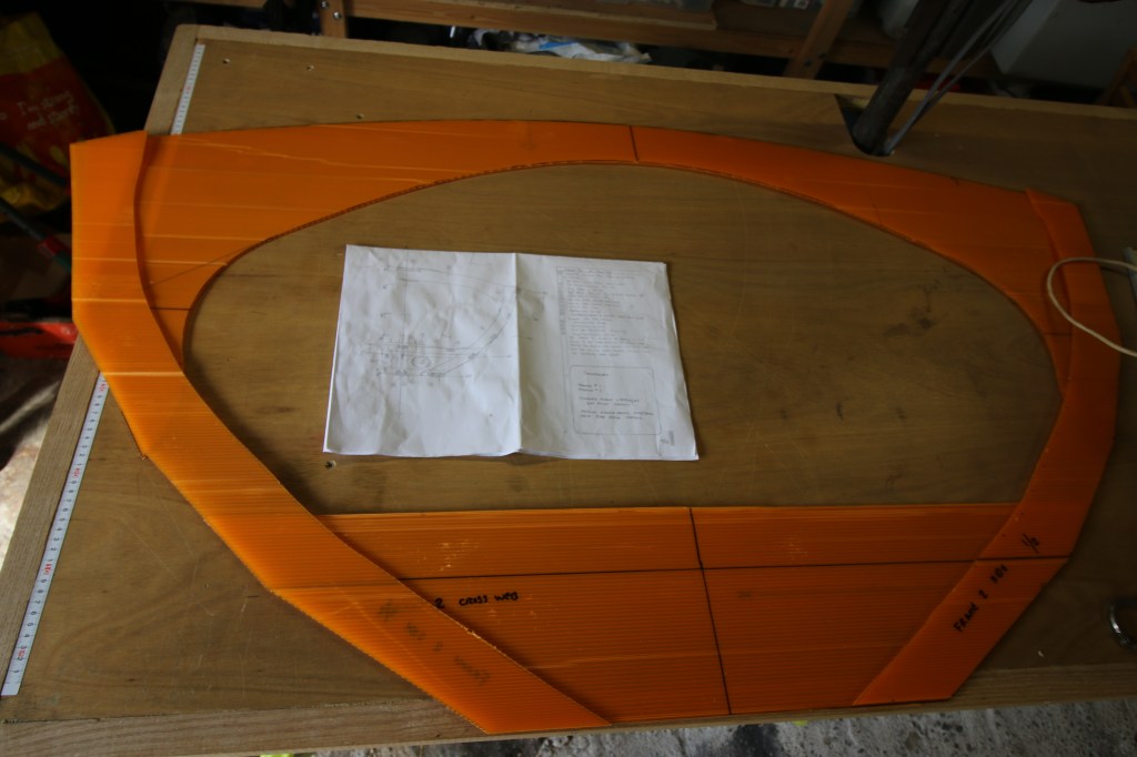 The bottom cross piece is quite simple because it’s basically 2 parallel edges and just with a simple chine point but here are the more complex side pieces for frame no 1, one already cut out and the second one all marked out and ready to cut. The material , by the way, is the orange corrugated plastic that my shelter roof came in.