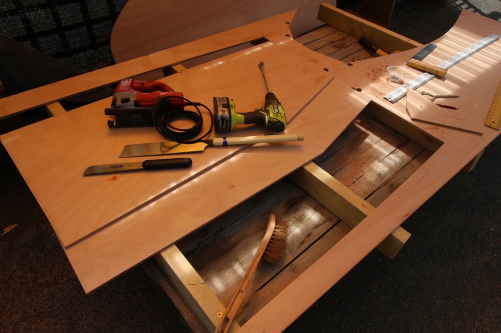 Enter the Dozuki….i used to keep a small Irwin brand pull saw on the boat and quite liked it but somehow iv’e managed to chip the blade and twist it slightly (very fine blade) so for this project i thought i would try a proper Japanese pull saw (Dozuki….which is the crosscut version) and experiment with that. My first go was disappointing as it seemed to create a lot of vibration in the cut until i learned to hold it very lightly, right at the end of the handle, angle the saw very low and apply minimal pressure…..that done and it’s the sweetest saw iv’e ever used : i’m an absolute convert to Japanese style saws on the basis of this project so far. The Dozuki i bought does also have a thin blade but slightly wider and stiffer than the Irwin and it has the classic almost sword-like long handle which i now think is critical in the type. I’m amazed how cleanly the blade will start a cut even at an acute angle on the edge of a sheet, how easily it is to keep the cut going straight and clean and surprisingly that i can also cut many of the large radius curves with it as well – the deck crown comes to mind.