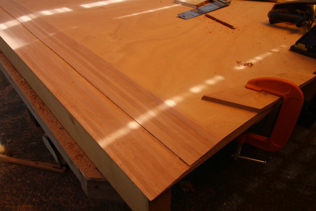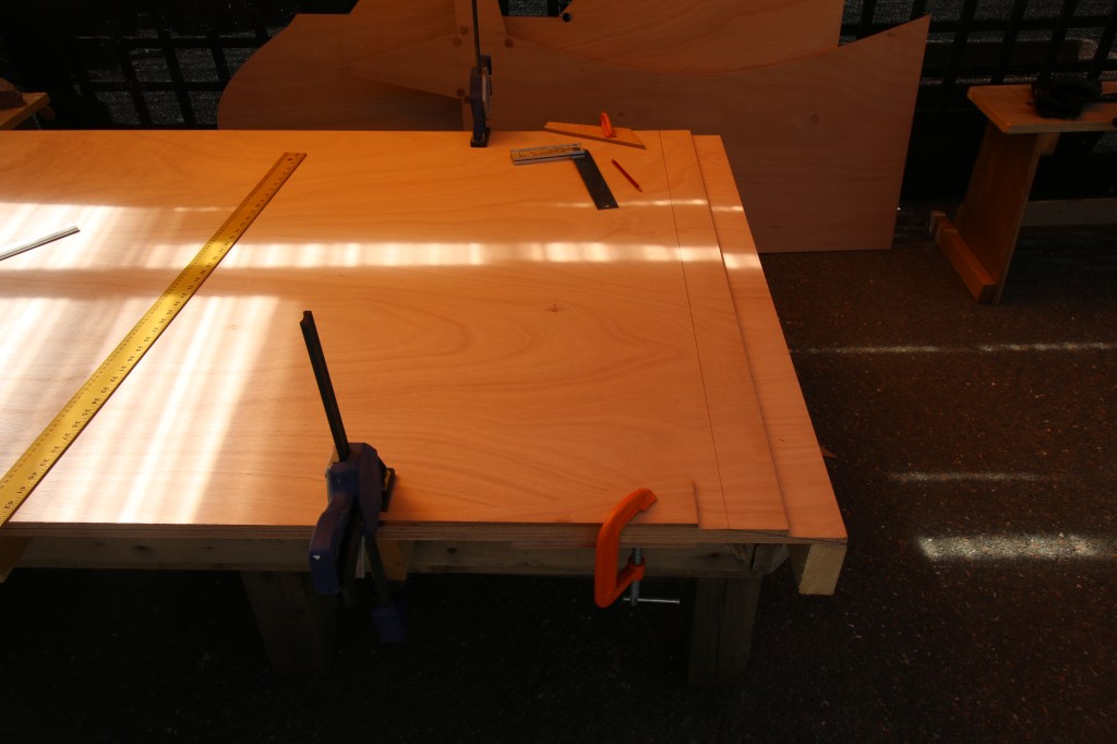 Once again this is our old garden picnic bench put to another use, so far it’s been my principal marking and cutting bench after i attached 4 plywood width lateral beams in cheap 2 x 4 PSE softwood. Because i put one cross beam at either end and set them square to the bench it made for a hard ‘sharp’ edge that would exactly support the feather edge of the bottom sheet as i planed away at the plywood.