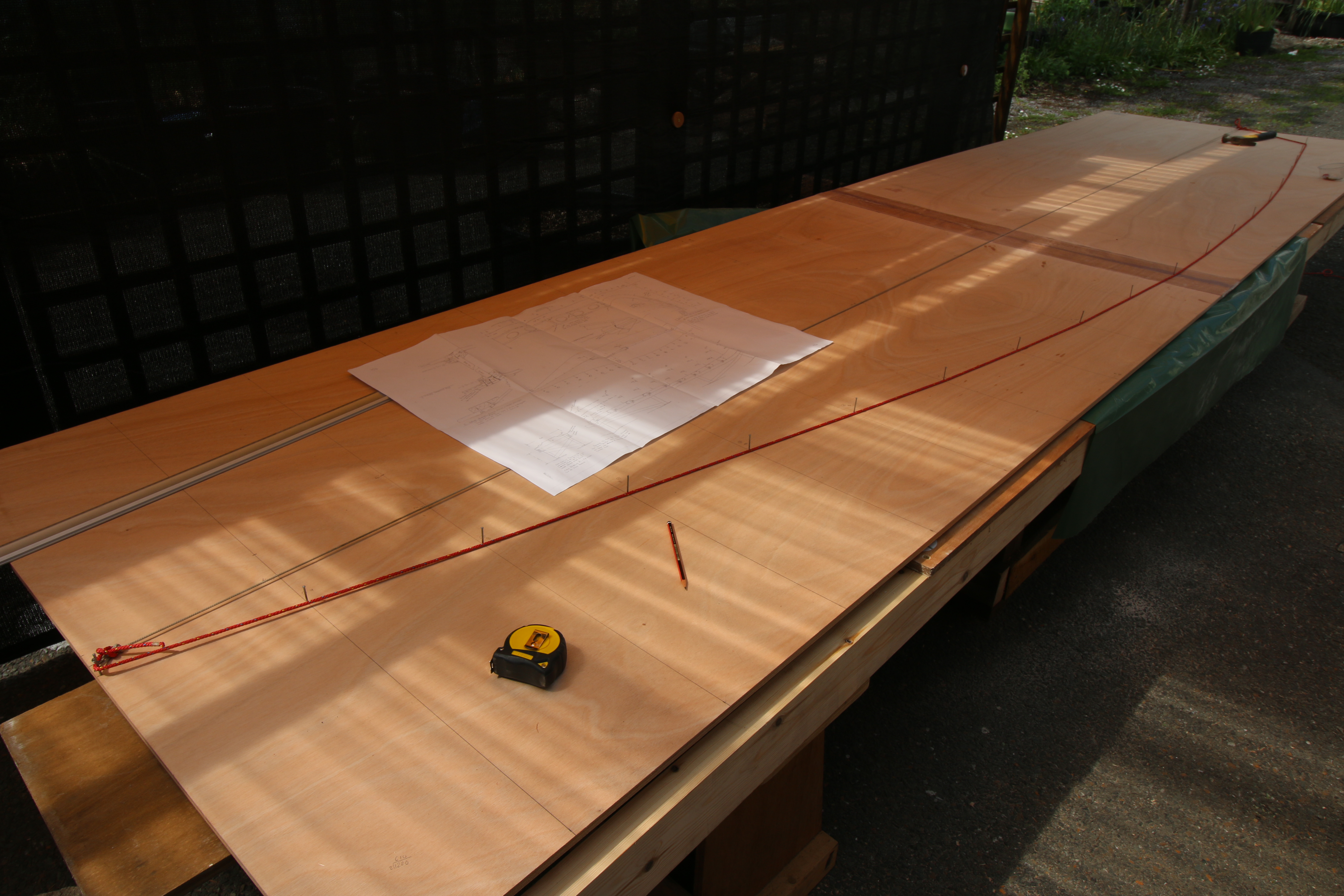 On the bottom panel the shape is defined by XY points just like the frames except that the way it’s drawn is via a 250mm grid which i marked on both sides , joined each side with 18 lines, marked the board center with a tightly stretched cord and then proceeded to mark out the station points from the centerline. The first side working back from the bow seemed to go well and even at that stage the points looked as though they formed a fair…..which is handy. My problems started with the other side ; in between doing the first and second side we’d had dinner with a glass of wine….we’re real lightweights here as even that one glass once a week makes both of us a bit tipsy…..anyway it was a nice evening so i decided to walk down to the village and back and then crack on and mark side 2. Unlike the first side though i chose to work forward from the transom line as that was the first part that i came to ; as before i marked the stations on the cross grid except that when i got to the bow i was 2 stations short. Realizing that i must have made a mistake i went back to the transom and started checking and of course my measurements were all wrong so i just made second marks – then when i got to the bow i was still a station short of a curve so i started once more but ‘cleverly’ working back from the bow which gave me another set of marks which didn’t match the first 2. By then i was far too warm under the shelter as the sun was coming right in the end so i gave up at that point.