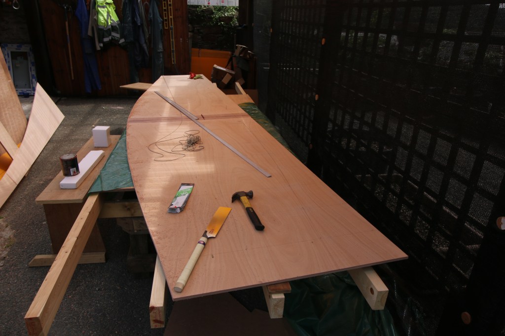 Blog time : it’s the end of May 2021 and i’m just about at the end of the flat-pack phase of my build project – iv’e cut all of the frame parts and now the centerboard case as well , then, because i couldn’t start the centerboard itself i decided to make the long bottom panel of the boat instead. To do that i had to first mend and then adapt my outside workbench such that it would support 2 full plywood sheets ; that wasn’t a great problem once i’d finished the repair as all iv’e had to do is attach 4 long lengths of 2 x 4″ plain square edged timber (PSE). On top of that iv’e attached a sheet of exterior ply and that forms the main deck to work on….at each end i just packed the gap between the long rails and panels with some scrap ply.