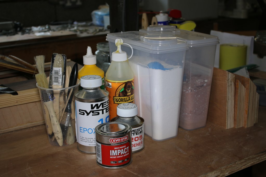 My epoxy trolley before adding a work surface and organizing the various powders and fillers into kitchen containers. Used gloves and mixing sticks go straight into the rubbish bag on the side. The big cans of resin won’t be stored on the trolley as they will get far too warm, instead they are stored inside the workshop on the cool granite floor. I might adapt my set-up to include a slab of granite or similar and cool that in the freezer at home….and then stand my made up glue on that to slow down the chemical reaction and give me a longer pot time/working time.