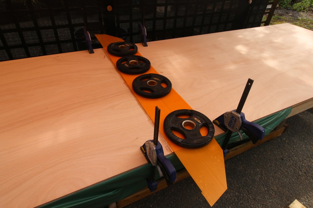 A few weeks ago, in real time, i cut the bevels for the bottom panel’s plywood scarf and because it was a nice warm and dry evening i went straight on to bonding the 2 panels together. To do that i lined up the first panel with the edges of the supporting deck which is also a sheet of heavy plywood….and with the scarf edge roughly halfway along the ‘deck’ : then, for a dry fit and check i just slid the second panel up to the first and lined up the scarfs trying to get the 2 faces as close as possible without one sliding up and over the other. Checks complete i separated the panels again and cocked the ‘upper’ scarf panel up on blocks, made up a batch of epoxy and brushed that onto both bevels first before making up the rest of the batch with microfibres to make a glue mix. Once i thought that the bevels had taken up as much resin as they were going to i spread out the glue mix just on the bottom bevel, moved it around until i was evenly thick and then pushed the upper board/bevel back into position. The final stage was to clamp both boards to the deck making sure that the sides all aligned and then weighting the top board’s bevel edge down onto the lower one with a stack of weight plates.