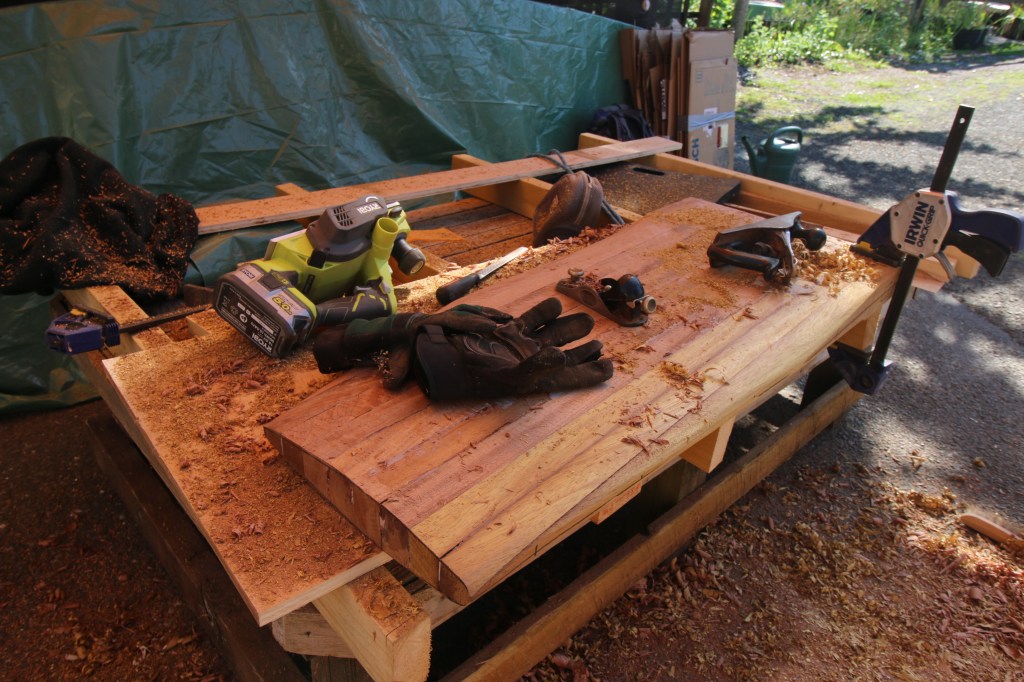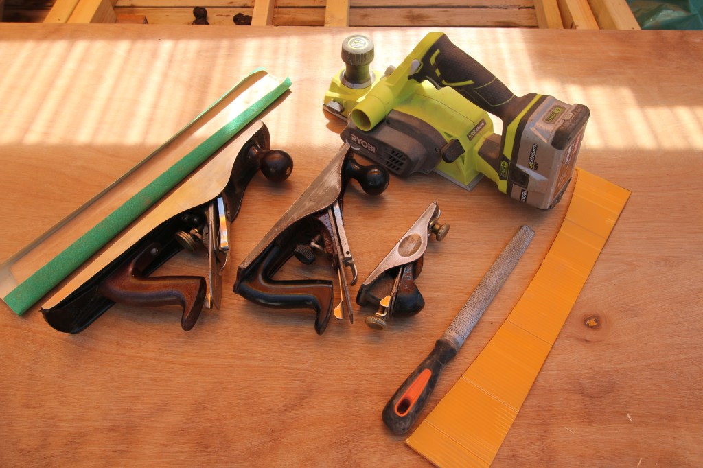 At the start of this project i posed a question on designer John Welsford’s FB page about what tools other builders had found most useful – i already had some of them which was a good start, invested in a few other basics (the Japanese pull-saws have been a boon) but generally taken to heart one answer/advice which was not to buy tools until i needed them ; but then when i did need a tool to get a good one . Up until this stage i haven’t had to buy very much but with the centerboard and rudder blank construction i really couldn’t see a way of doing it without either a table saw or finding someone locally who has one to do the work for me. I do know a local woodworker who is very good and has all of the machine tools (table saw, bandsaw and thicknesser-planer) but he’s a very busy bloke and wasn’t at his workshop when i dropped by to ask him about my job. Because of that i used the entire month’s boatbuilding budget to buy the table saw and a secondhand jack plane…..the latter to help me true-up the edge of the bottom panel which came out a bit wobbly .