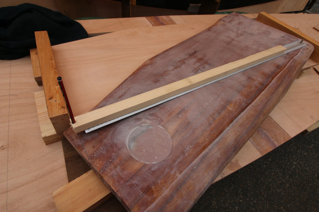 Well…..today for example i spent all day just mocking up the position of the board in it’s case, eventually finding the right pivot position and putting a bolt in temporarily , then making a tool so that i could mark the radius of the aft edge of the board…..cutting the end/aft radius so that the board clears the aft edge of the case…..and this evening making and attaching a small Iroko shoe to protect the leading edge and the first few inches of the vulnerable board bottom.