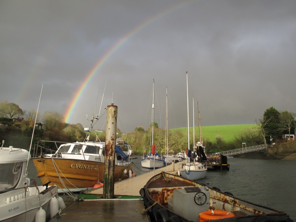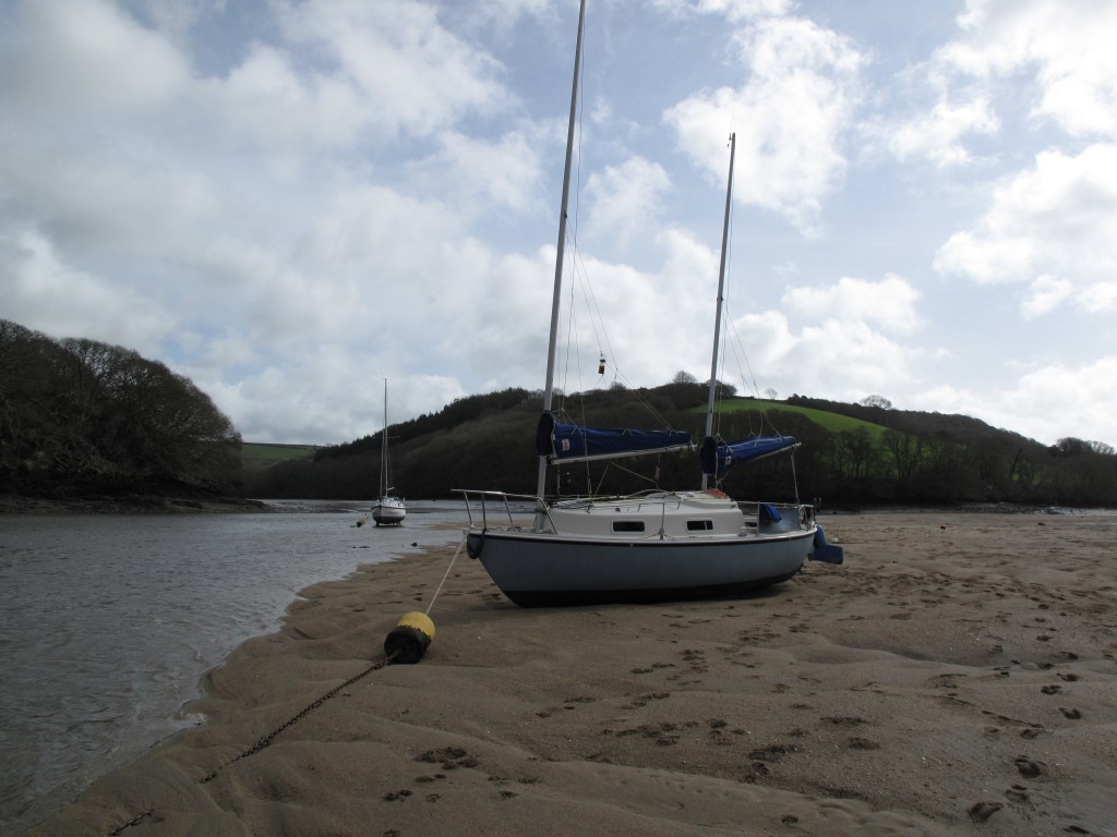 There seems to be a tendency among many sailors to view the main port, harbour or town of any place to be ‘it’ and to not realize that there might be sheltered moorings or anchorages away from the town – i noticed this particularly among the modern generation of cruising sailors who often only seem to cruise from expensive marina at one end to noisy town marina at the other. Back in 2016 when i first bought the little centerboard Liberty i realized that not only could i go pretty much anywhere that i could wade and that i could consider most of those places as somewhere to moor or anchor ; i certainly didn’t need to be swinging on a deep water mooring for example. In Fowey iv’e often picked up a mooring at the northern end of Chapmans pool just beyond the China clay quay – either early in the season or late in the day, or on the right state of tide headed a mile or so further upstream and picked up a drying mooring off the little village of Golant.