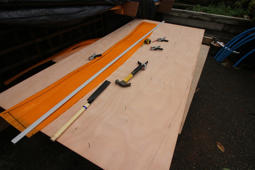 Where that takes me is to think about many aspects of the design and layout – whether those features help, hinder or are just neutral ; also what problems and situations i might meet that would make me consider modifications and alterations at this stage. Right now i have the boat at not quite ‘bare shell’ stage – iv’e got all of the stringers on and i’m just starting on the planking ; iv’e also been spending a lot of my break times just sitting at the boat, looking at the layout and thinking about how i’m going to do things like the ballast, buoyancy and so on. Just as an example before i get going with the kind of technical stuff that i’m working on – today i was thinking about the volume of the big open cockpit/footwell and wondering about reducing that volume by half and just having a shorter footwell ; the idea there being to reduce the potential flooding volume and weight in the boat – and alongside that thought where to site a bilge pump or 2 !.