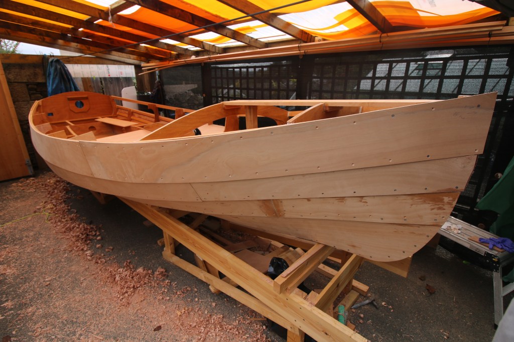 Well, it’s the end of my main boatbuilding time for this year, as i write it’s pouring with rain and the boat is all tucked in underneath it’s tent. I’m happy to say that all of the planking is on and today i even finished all of the ‘tingles’ that form the butt-straps….even done some interior sanding. Here then is a couple of pictures of the build as it is now – a complete hull all planked up but nowhere near finished.