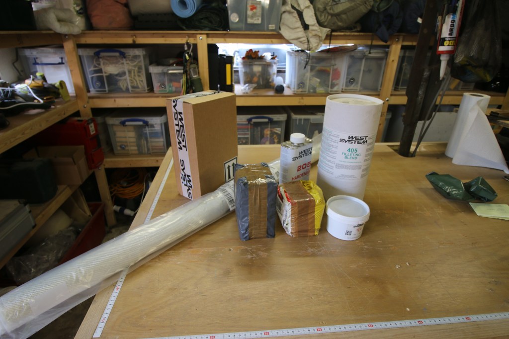 What to buy….my opinion and suggestion only for anyone setting up a build project is to buy 5 Kg of resin but to buy both slow and fast hardeners ; i made a mistake in only having fast hardener early on which caught me out when i had a big glue job start to set before i’d got all of the clamps on. That much resin plus hardener would be plenty enough to do a lot of the early work with ans then buy resin in 5 kg lots as the work progresses. I bought one each of the medium sized tubs (around 800 Gm) of microfibers, high density filler and filleting blend as i already had some low density filler in stock. At the end of this year as i finish the hull construction iv’e got through most of the microfibers and high density filler but not used much filleting blend – i think because iv’e tended to finish most of my frame to hull joints and plank joints with a high density fillet.