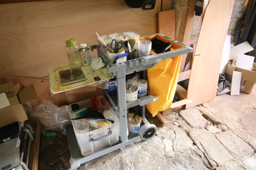 I took a look at the Gougeon brothers (West System) book and that suggested building or converting a trolley/bench like structure so i had a search on local buy/sell sites and Ebay to find something suitable : what came up best was a simple and cheap janitors cleaning trolley that i could easily convert with the addition of a small mixing bench which i added on one side. The photo below shows my glue station in it’s normal state and everyday set-up – a small amount of glue and hardener ready to use (top left) kitchen containers full of microfibres, high density filler and low density filler (other additives i use less are on the bottom)….then a pot full of mixing stocks, a box full of heavy grade Nitrile gloves, mixing pots and the brushes that i use when i’m applying lots of glue. My larger tubs of additives an the main cans of resin and hardener live elsewhere in the workshop and my usual routine throughout the build is to top everything up on the trolley as a regular Sunday job….the usual day i clean and tidy the workshop.