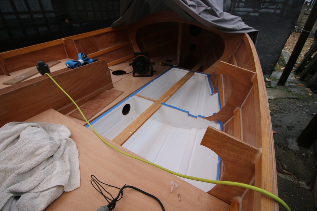 My intention is to finish the insides of the forward compartments by the middle of the month, fit (glue and screw) the tops down and glass/epoxy tape all of the long joins in the plywood. In terms of work forward that’s about it done before i think about turning the hull over – my main constructional work now is aft in the cockpit and in fitting out the large storage compartments in the middle. I might take a look at building a mock up of my proposed cuddy but what i have to work towards as a priority is getting the hull turned over, faired, glassed and sealed. I had to quickly go out and buy a space heater because my new fan heater packed up after just a few weeks on the job.