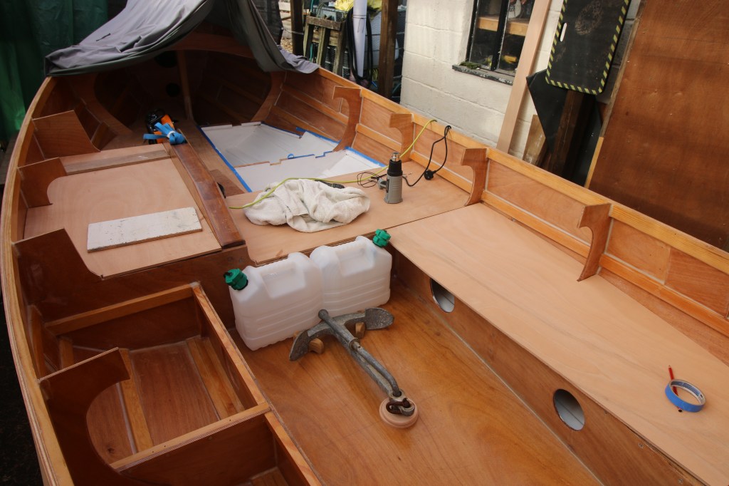 As i slow down on the practical work for this year i’m spending a bit more time planning some of the systems and features that i want to work on early in the new year ; the electrical system for one because iv’e got to install some cable runs before i seal the forward compartments but also the rig and the shelter which at this stage i’m thinking will be an open backed cuddy. I’m also trying to keep my eye on the bigger picture which still has to be to get the hull ready to turn over which i want to do some time in February and so that i can finish the outside/underside of the hull – iv’e yet to fill and fair the screw holes, fair all of the clinker plank edges , make and fit the skeg and outer stem and then glass coat the entire hull. I intend to go back into full time work on the hull in March with hopefully some dry spring weather….. that doesn’t always happen here.
