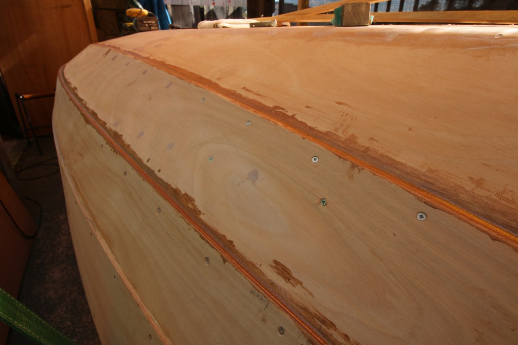 March 2022…..well, we had one nice week when the ambient temperature came up to 10 c during the day and that was my signal to get on with the work again – in two days work i got the hull turned over and then over the next few days i did a combination of filling/filleting and then fairing of the lapstrake plank joints. At the end of a week’s work i had 7 of the 8 plank edge joints faired to shape, half of them filled and filleted and the same ones planed and sanded to a nice edge – then, the air temperature dropped to 6c again and the wind came up ; now, it’s colder and windier than it was in February and i can’t get a whole run of plank joint (17 feet) warm enough for the epoxy filler.