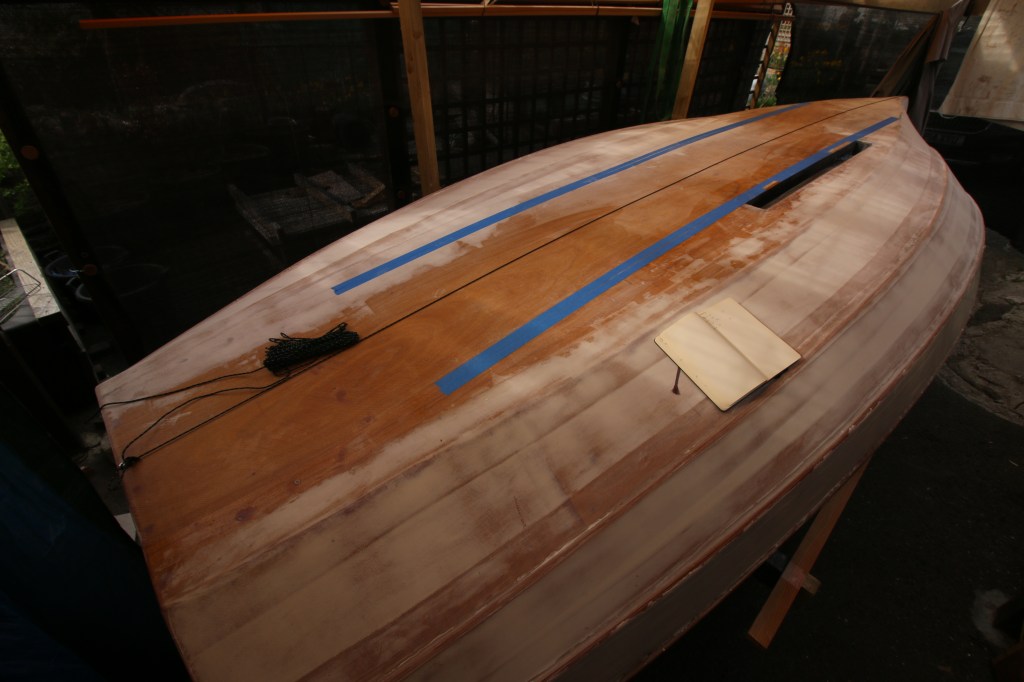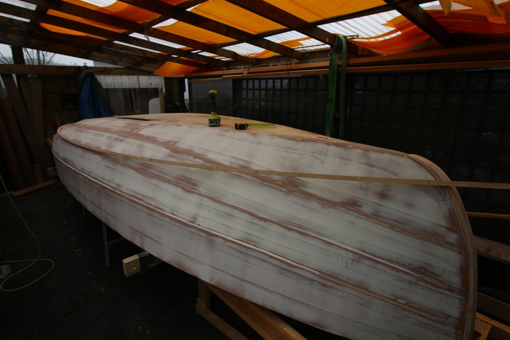Last week i think i completely finished the heavy sanding work of the entire hull and that included, right at the end, glassing and filling the transom and then going over the plank laps with a bead of filler and cutting that back with a specially made sanding block. After that and for the first time i not only dry-vac’d the whole boat but i also got a bowl of warm water and some detergent and wiped the whole hull clean as well……as far as i can see it’s ready to mark in a waterline and get some primer on but i can only do that once iv’e made and fitted the twin skegs. What happened with that is that my project organisation broke down and i completely forgot to measure up for the skegs and order the timber – that and the timber merchant being busy with other work means that i may not get the wood for a few days more so i’m kind-of scratching around for jobs that i can actually do, then as well it’s due to get a bit colder yet and wet as well for a few days.