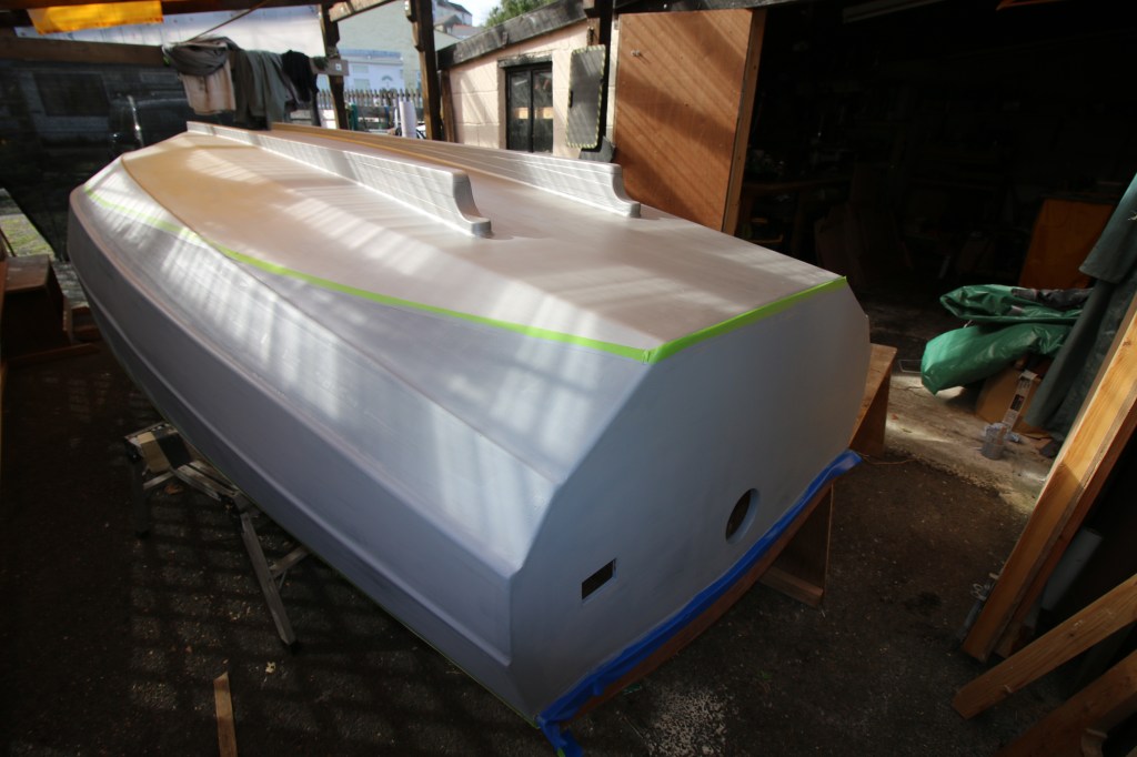 This afternoon while I was working my partner came out to see if i wanted coffee …..I always want coffee…..but found me lying on my kneeler mat under the bow of the upside down hull ; what I was doing there was trying to work out how to use the bow girder to sit the heel of the mast on and how to modify the king plank to support the rig at deck level. I think that the king plank will have to come out because honestly it wasn’t my best work and needs to be much better and stronger as partners for a powerful Lug rig……I think i’ll just leave the compression post in just in case I change my mind later.