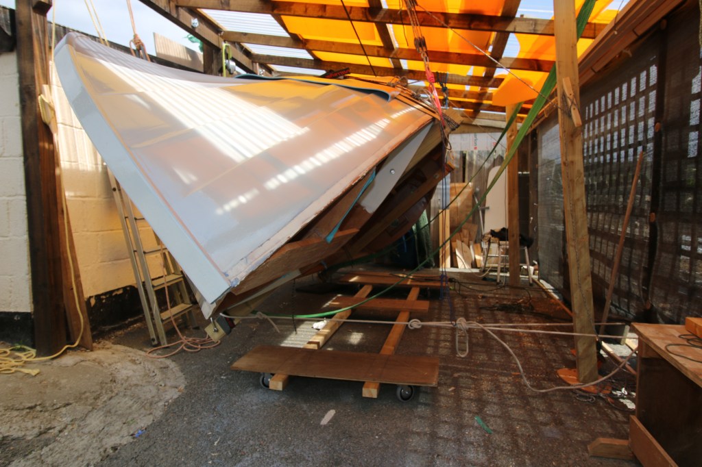 I finished the paintwork with one coat of topside gloss because it’s an easier finish to keep clean if (when) I spill any glue on it, left that to harden for 5 days and then set up and turned the hull over ; took about 5 hours including making a set of wooden cleats because the ones I ordered were a no-show. In brief – the hull had a pair of 2 x 4 beams bolted to frame no 2 forward and via risers to the small half frames aft, I also lashed and strapped the hull directly to those beams. Next – I set all the gear up which is the 2 roof support posts one side, 4 tayckles and a pair of safety straps, heaved the hull off the build frame and supported that with the straps while I pulled out the build frame. The build frame goes in the space next to the shelter and becomes my coating and painting bench now and the spar bench later.