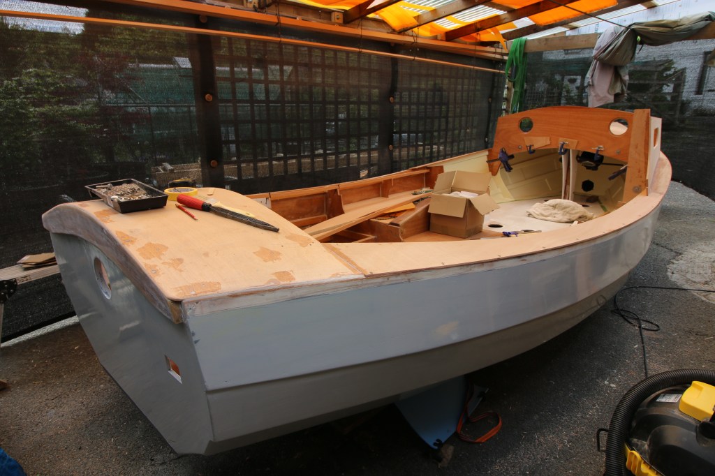 The hull changed dramatically again this week when I used all of the previous week’s effort of making and dry fitting parts in two long days of finishing and gluing on quite large bits of boat : the foredeck and fore/side decks all went on as did the stern deck, it’s doubler, the cuddy face and one side and finally the aft side deck and it’s bearer. That was quickly said but in total that was a whole week of work finishing this morning with planing and sanding the deck edge all round, backing out about half of the screws and filling the holes. I even got under the foredeck and primed under there….oh, and prepped all of the holes to fasten the bunk/deck access hatches – that’s 48 holes bored, epoxy filled and bored again.