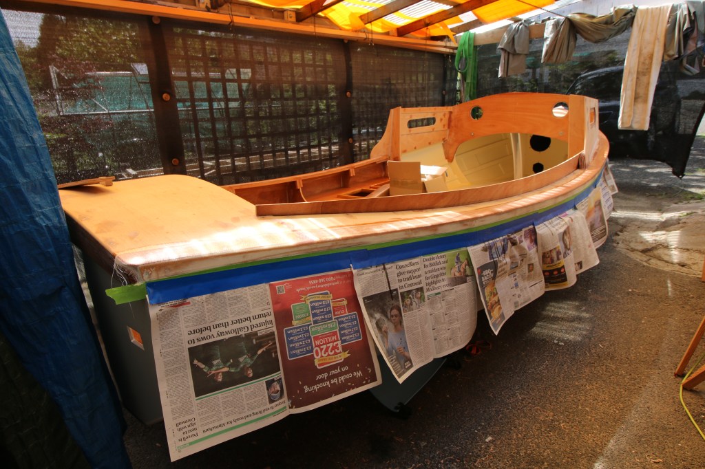 The big visual difference is the cuddy I think – where I was a bit worried about the apparent height of the side when it was a bare panel of plywood it looks a lot different with the side window cut out – in fact it makes the cuddy look longer and lower. The awkward job this week was at the aft end of the cuddy side where the foredeck extension and the aft/side deck meet with the bottom edge of the cuddy side and the aft/side deck bearer ; there was some colourfull language when I was trying to bend in the side deck bearer which actually went in after the side deck was on…..it’s all on though. What I failed on was the aft/side deck coaming -I made several patterns with the orange plastic material you can see in the shed roof and none of them looked right….so that’s a ‘return-to’ job for next week.