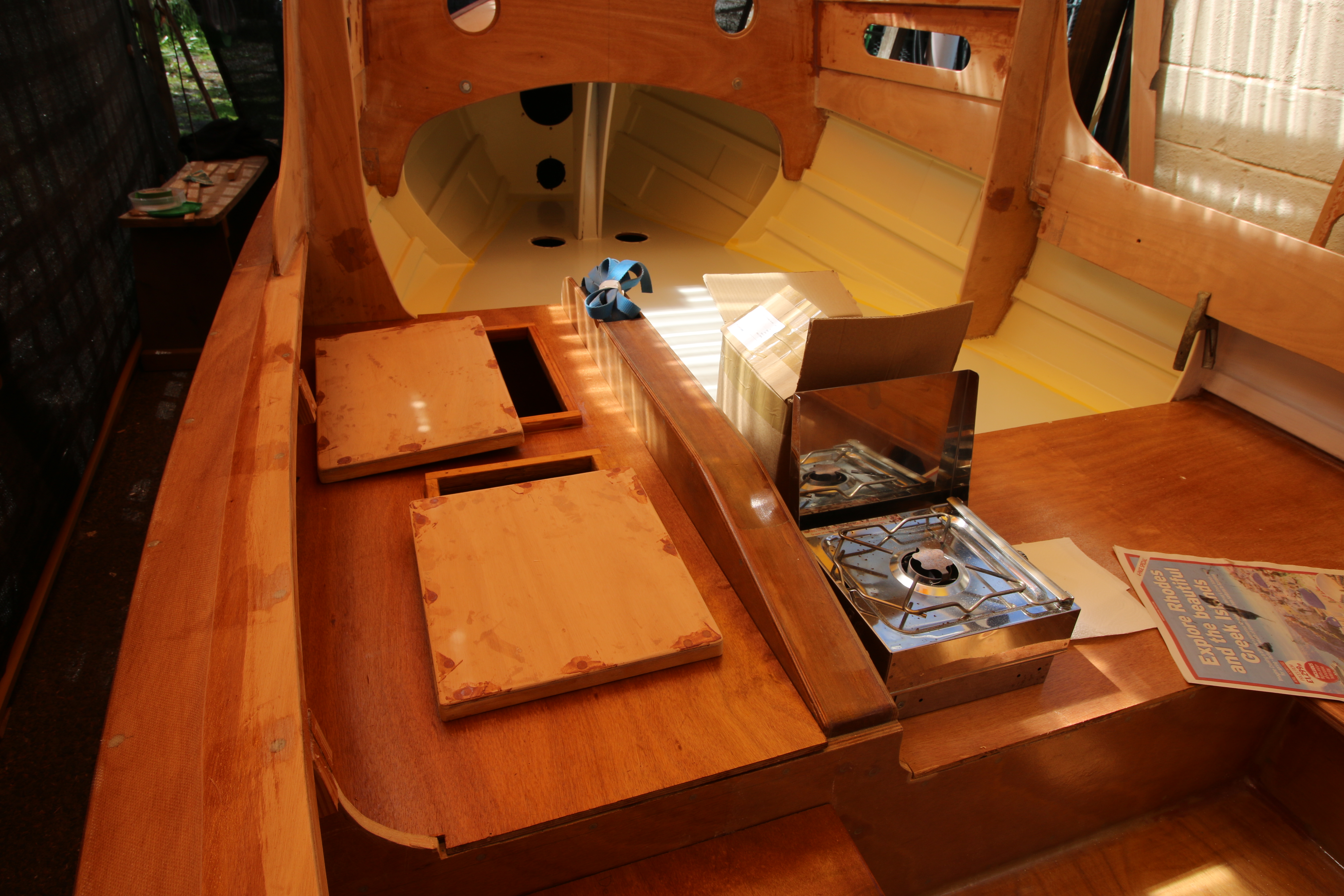 So, in this post there are two plans deviations going on – first is the open back cuddy as above and the second is a wider (deeper) stern deck. The original plans show a narrow stern deck which gets bored out for the mizzen, my version is a lot deeper because I intend to mount a long but narrow PV panel (Solar panel) there and either a 40 or 50 Watt semi-flexible panel should fit there – I’m thinking in terms of a large AGM battery under the mid deck and two solar panels to charge that with ….either one small panel either side of the foredeck or a larger one on the cuddy roof. Long term iv’e been thinking about an electric drive so I want as large a battery as I can take and as much charging power as I can fit. The only part of that which I have to fit during the build is the large AGM battery which I think will be similar to the one I fitted on my last cruising boat ; that was 160 Ah and I’m going up a bit with this build – the battery i’m intending to fit weighs in at 60 Kg so that will be most of the ballast weight accounted for.