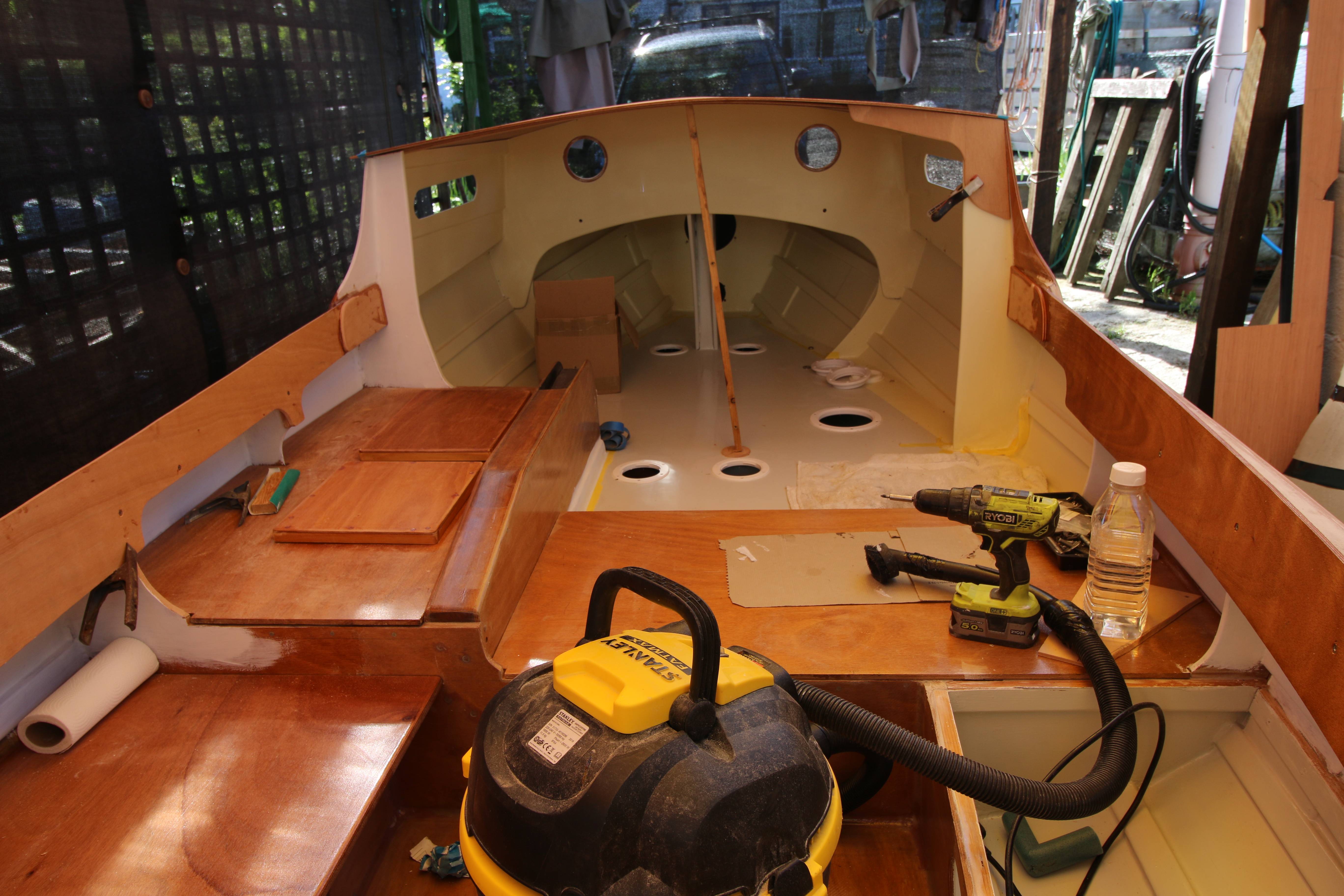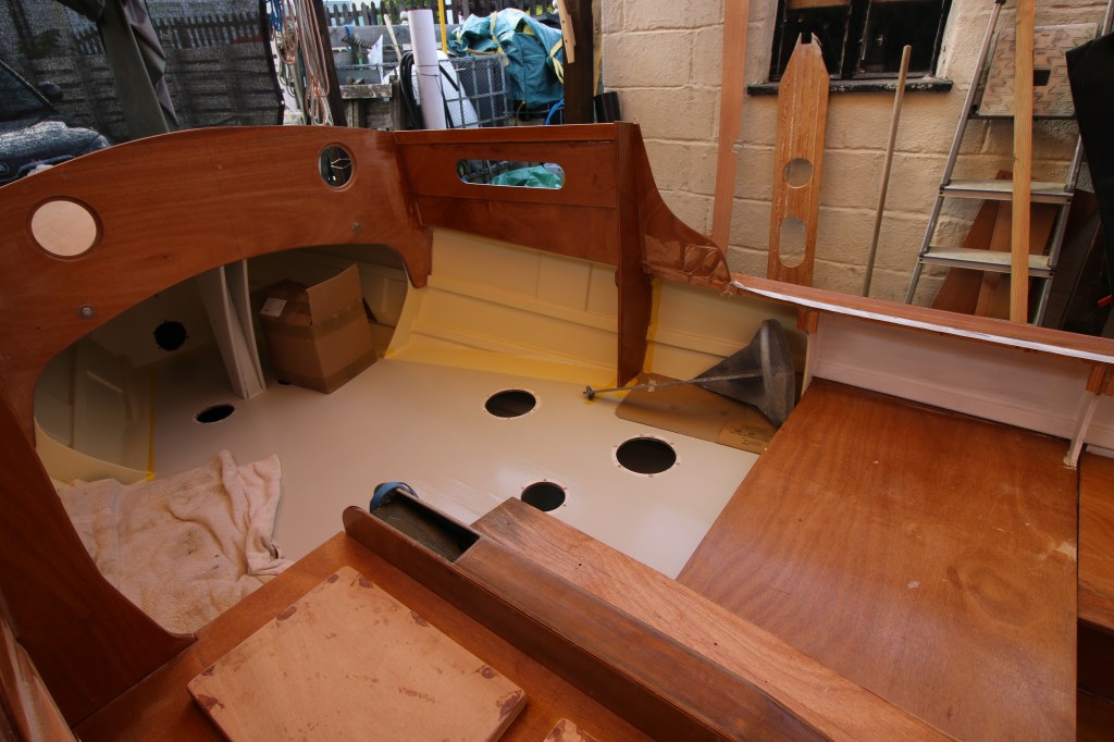 7.Aft – cockpit lockers primed and painted except for the stern locker where I have yet to sort out the mast foot arrangement.