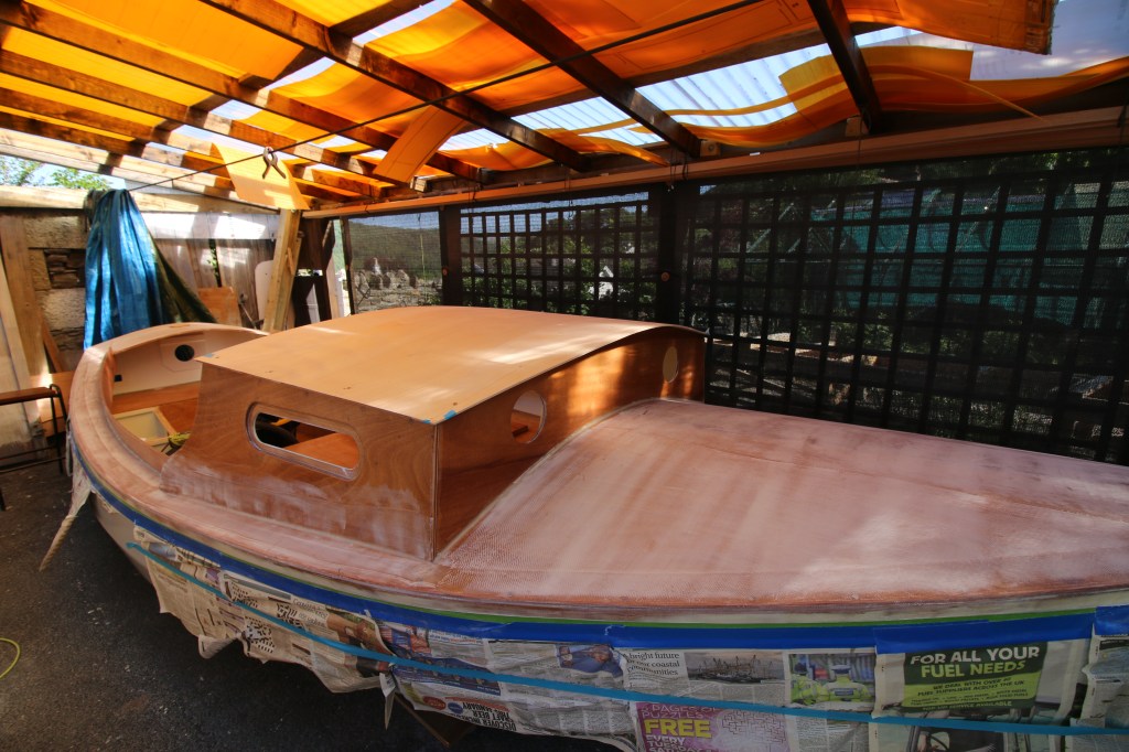 My main organisational/project management jobs this week were – firstly bidding on and ‘winning’ the Origo stove in an Ebay auction, second….making first contact with the sailmaker and discussing the sailplan ; one night during the week I got the set of drawings out and played around with drawing my rig over John’s drawing for the Yawl version – my version will have a taller mast which will be slightly further aft but with a shorter gaff and where the sail will have a more vertical leach and be shorter in the foot. Third organisational job this week was ordering more of the materials that I’ll need next ; 2 sheets of 5mm plywood to make the cuddy top from, some more glass tape and cloth for the decks and cuddy top and more basic consumables……as I write we’ll be taking a break ‘dreckly’ as we says down-ere…..and heading into town for a coffee break and to visit the country store which just happens to stock the thicker Nitrile gloves that I use……ideal for working with a fingertip to smooth an epoxy fillet or for sticking said finger up a horses bottom I guess.