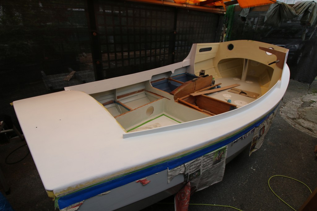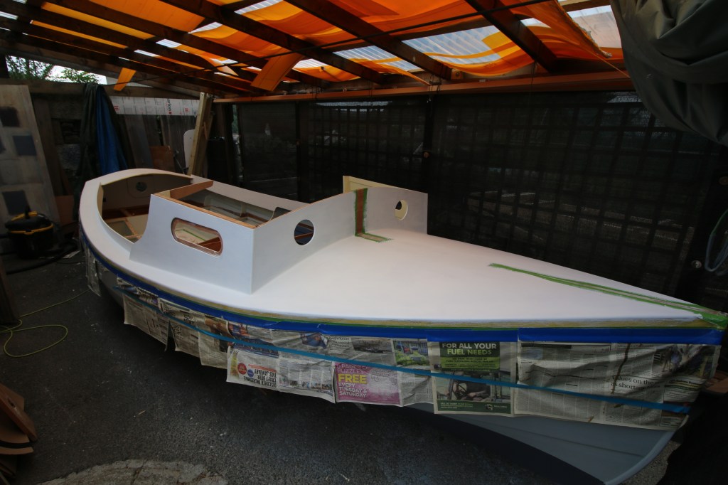Where i’m trying to get to now is the point at which the boat has most of it’s final finish and appearance and then where I strip out anything that shouldn’t be there – tools etc, clean and pack all of that away, clean and tidy the workshop and the building area and then pull the covers over and leave the whole thing alone until the beginning of July. I feel that there’s less of a rush to be on the water now, mainly because I can’t afford the long list of fittings, sails and trailer etc so it’s entirely likely that I will launch the boat next spring unless something different happens. So, one more week of work and what I hope to get done is to finish the decks, coamings and cuddy with at least one intermediate coat and one topcoat – today, as I write, a glued the galley locker hatch top on and this week I’ll do the same with the seat tops ; my big plan for this last week of work though is to do a video walk around the boat because it’s the one big thing that I failed on throughout the project.