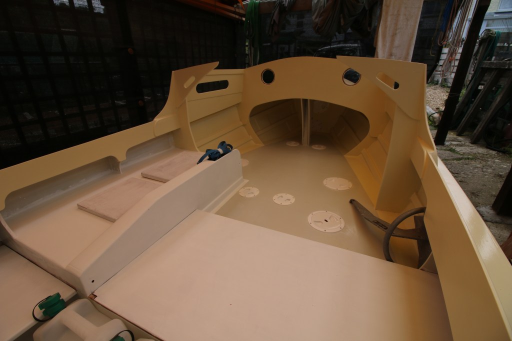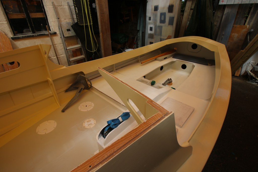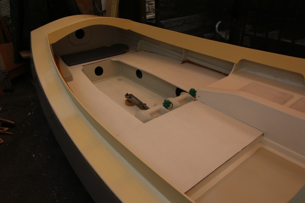 During a very noisy week I applied one more coat of primer, one intermediate coat and then 2 coats of topcoat – a satin multi-coat on the inside of the coamings and a standard cream gloss on the decks and cuddy, as well as that I tried to finish priming everything that I hadn’t got around to on account of having run out of paint. At the end of the week I stripped off the protective masking skirt, vac’d the whole boat out and transferred all loose gear that belongs to the boat into the boat and roughly where it’s going to live – thus anchors, water containers and my new stove ; this also allows me to empty the workshop of trash and plywood waste and then get at our camping gear.