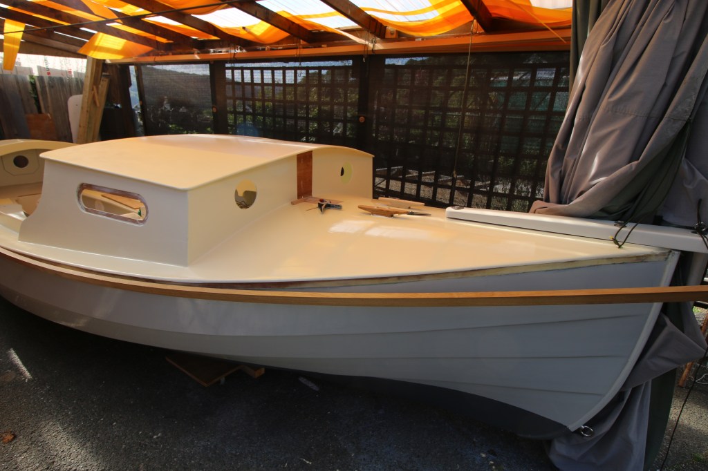 Making and fitting the rubbing strakes is one of the last jobs of the main construction stage which gives me a complete hull structure but not fitted out yet and the rig not built. In the whole build iv’e only ever had to do one scarf joint and that was to join the bottom boards – so although I got a reasonable scarf joint in the 2 plywood boards it didn’t matter too much as long as it was joined and strong – it would all be covered anyway.