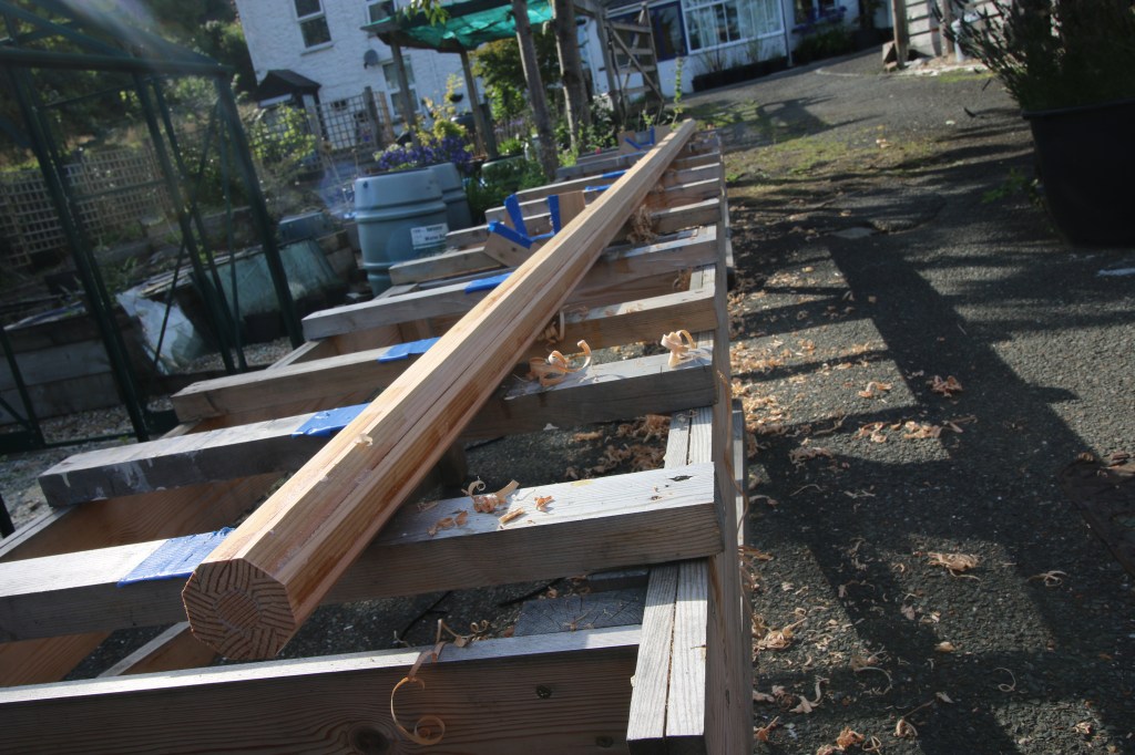 The mast was the main job of course and it’s that that’s been my main effort – it’s an 8 sided birdsmouth pole mast with filler/blocking pieces at the butt, the sprit point, the first gaff position and the tapered topmast. I think it’s one of the most careful pieces of woodwork that iv’e done on the whole project but most of my ‘success’ (if it turns out well) must go to the straight, true and clean Douglas Fir staves that John Moody supplied.