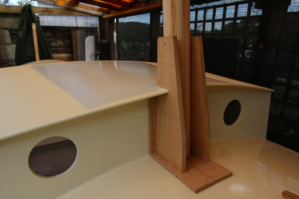 This morning, as I stop for coffee and a break iv’e just finished filler coating the layer of glass bandage that runs up the aft side of the pole….some degree of abrasion resistance for the gaff I hope. Later on i’ll carry on working on the tabernacle which is mostly made but needs some epoxy fillets, epoxy coating and suchlike.
