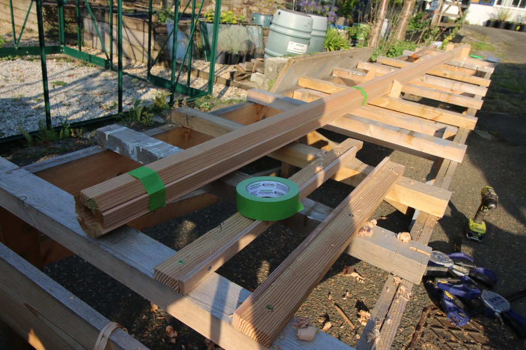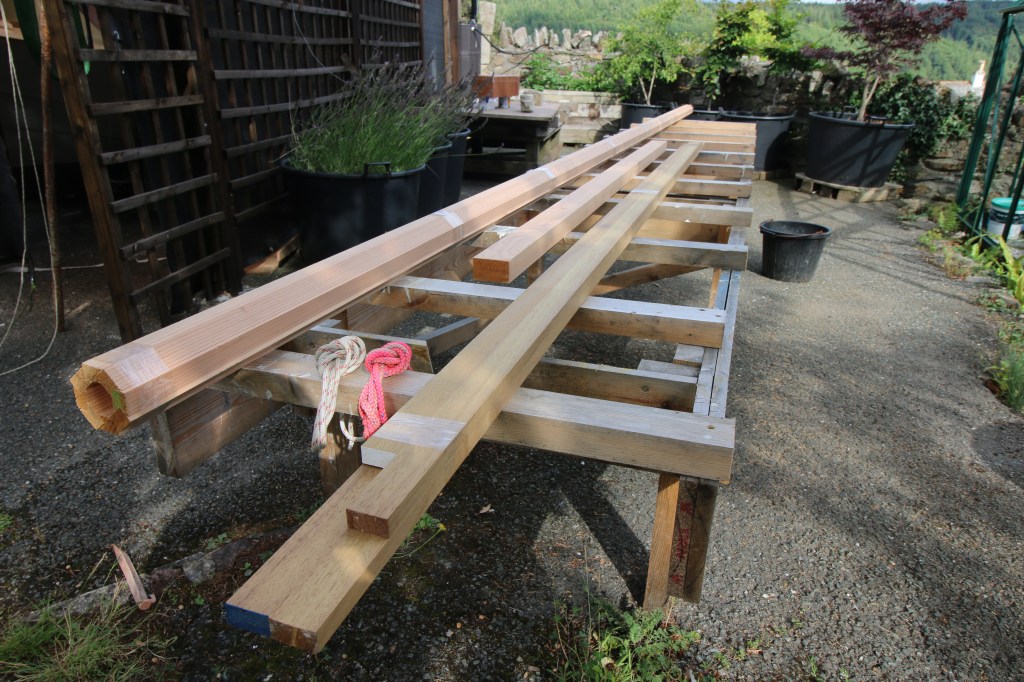 One day, with very few main jobs to do that day I pulled down the long length of Douglas Fir that I ordered right at the start alongside all of the stock for the stringers and bearers – thinking to quickly make the boomkin. What i hadn’t noticed though was that the cutting list gives one length and then the actual boomkin drawing gives a longer length – I checked with the forum and found that I did in fact need the longer length so that came with the last timber order and it was a nice job for an afternoon to mark out and shape the boomkin.