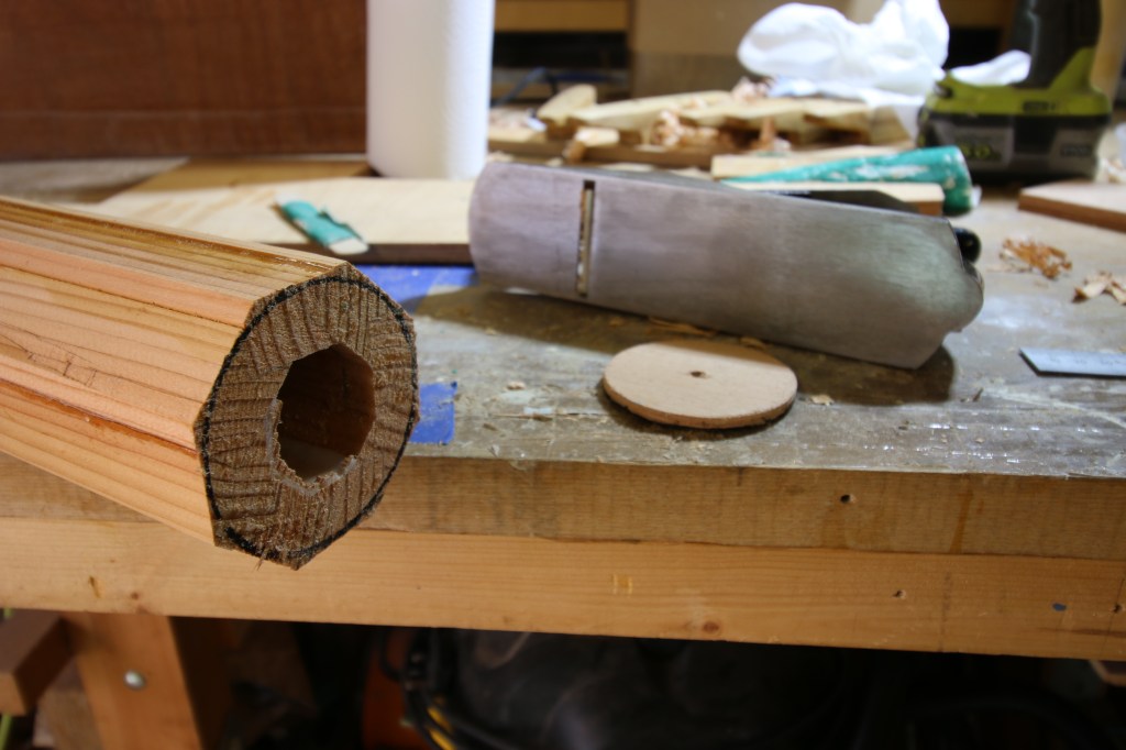I deliberately made the pole mast over length so once it was all cured I cut the blank end off which gave me an 8 sided ‘tube’ to play around with in the workshop ; there, I worked out how to turn the 8 sided blank with sharp corner edges into first a clean octagonal tube and then a rounded one. Taking that knowledge out to the mast itself I marked out where I wanted it to stay as square edges and then set-to with my various planes – first off just trimming the edges off and then going on to do a full ’round’ of most of the tube.