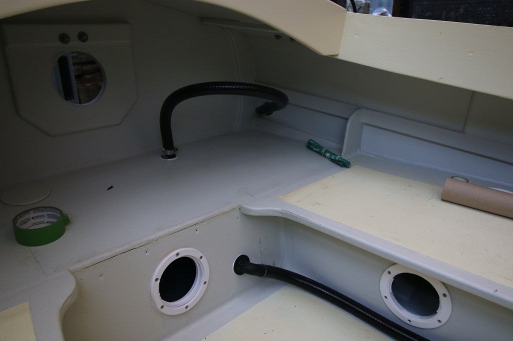 This has been a horrible job because iv’e had to work ‘blind’ most of the time and working with my arm stuffed through one of the inspection hatches to get nuts on or the hose onto it’s spigots. The job seemed to call for the hose going through the aft compartment and of course that’s sealed now aside from a 4″ inspection hatch so I can only use one hand on the job. If I had thought about this at the time I would have fitted all of this before the cockpit and aft compartment lids. Some time I really must work out what the practical limit is for the distance away from an access hatch can be and to just be able to get a nut on the bolt !. With one of the securing bolts I just couldn’t get the washer and nut on so after an hour trying different techniques I gave up and brought the bolt through from inside the compartment by holding it with a mole grip and feeling around blindly for the hole……a small amount of epoxy and filler keeps the bolt in place now.