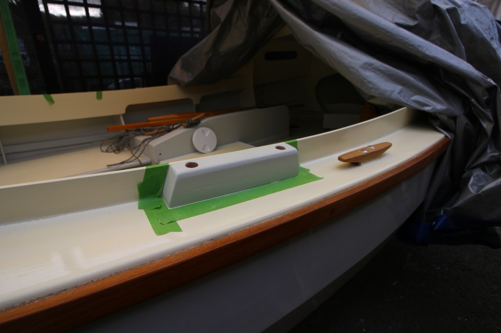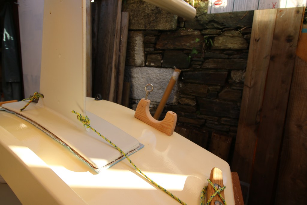 Blog time : it’s the end of week 3 of year 3 of my Pathfinder build and I can confidently say that nothing of importance got done this week because what I am waiting on is the trailer to be built at one end of the country and delivered to this end at which time we will go and collect it and then the work really begins. The only practical things that I got done this week were finishing and fastening the two oar risers outboard of the cockpit coaming – that being just about the last practical job that I can do before really having to heave the boat out from under the shelter and start to rig the boat. After last week’s excitement of having the name painted on the transom it’s been a flat…….although interesting week.**