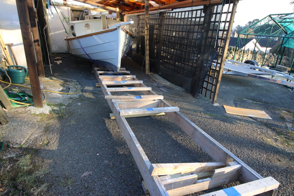 The technical aspect here is that my boat is non standard in that it has a pair of long but shallow skegs rather than a single central skeg so a major part of the modification will be to have rails and rollers directly under those to take most of the weight of the boat. I suspect also that I will need to make and fit a pair of fixed ‘bunks’ or pads that the forward end of the garboard plank will sit onto and then a removable pair aft to allow the boat to slide on and off the trailer.