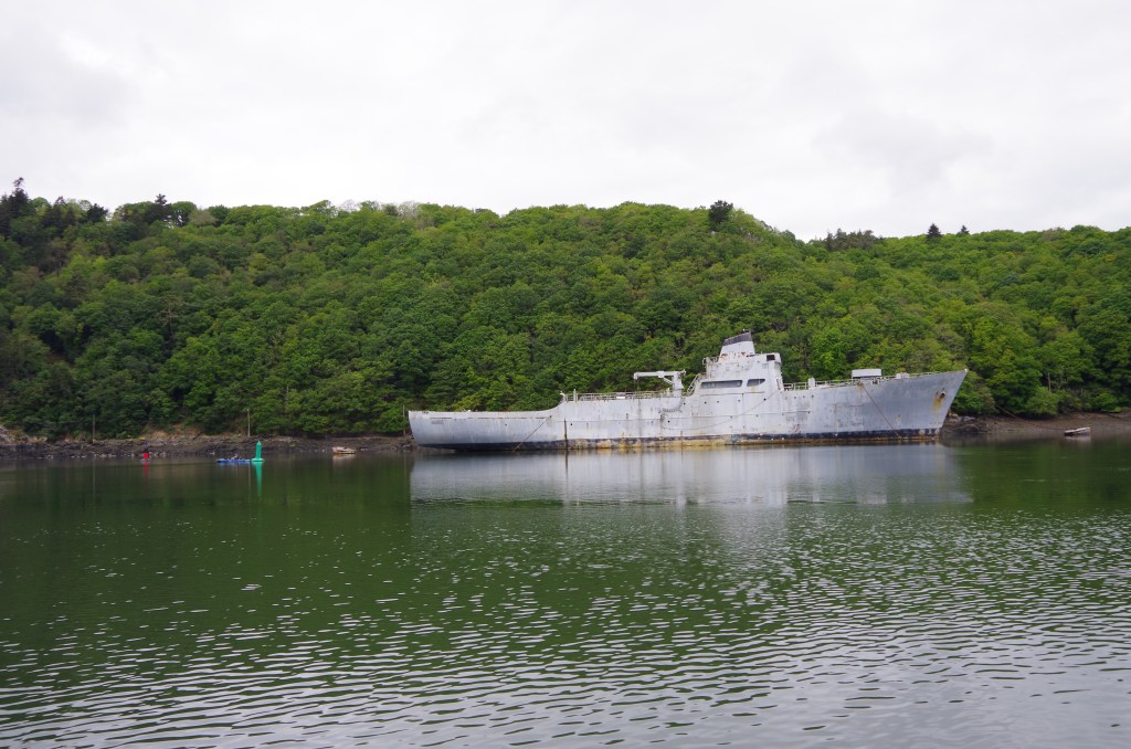 That day, when I swept into the Aulne it was with a fair old wind ‘up the bum’ and on a strongly rising spring flood – thus by the time I got myself organized, sails down and anchored i’d already been pushed upriver towards the curved suspension bridge and given that there was enough water I simply anchored right there. The next day I tried to find the deep water channel in the Aulne that eventually leads to Port Launay ; I failed, partially because my depth sounder didn’t work and partially because I didn’t have a local French chart. Instead of motoring upriver I just ‘shifted my berth’ back down towards the warships and a few anchored yachts and my plan was to take the dinghy ashore and maybe walk up the Abbey that is up on the hill at Llandevenec.